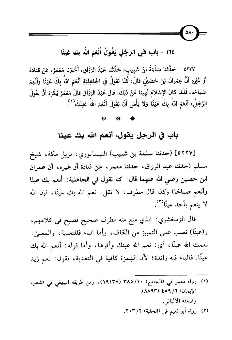 [5227] (حدثنا سلمة بن شبيب) النيسابوري، نزيل مكة، شيخ مسلم (حدثنا عبد الرزاق، حدثنا معمر، عن قتادة أو غيره، أن عمران ابن حصين رضي اللَّه عنهما قال: كنا نقول في الجاهلية: أنعم بك عينًا وأنعم صباحًا) وكذا قال مطرف: لا تقل: نعم اللَّه بك عينًا، فإن اللَّه لا ينعم بأحد عينًا (¬2).