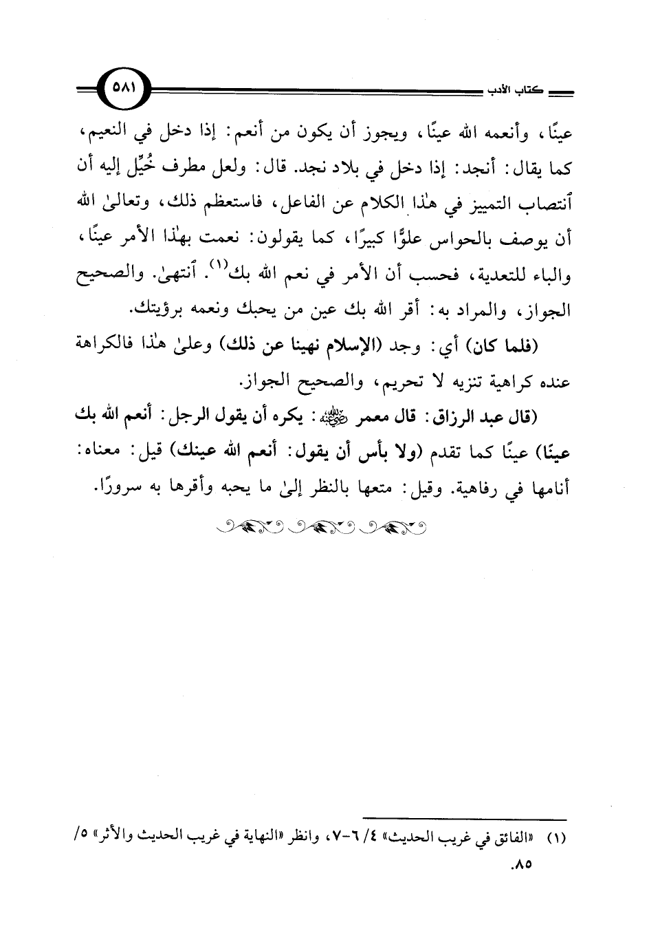 (قال عبد الرزاق: قال معمر -رضي اللَّه عنه-: يكره أن يقول الرجل: أنعم اللَّه بك عينًا) عينا كما تقدم (ولا بأس أن يقول: أنعم اللَّه عينك) قيل: معناه: أنامها في رفاهية. وقيل: متعها بالنظر إلى ما يحبه وأقرها به سرورًا.