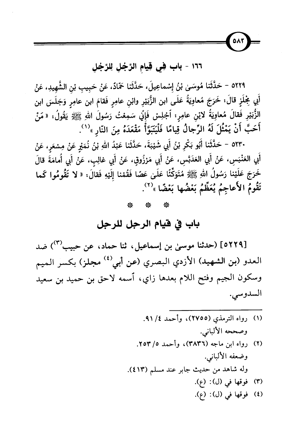 [5229] (حدثنا موسى بن إسماعيل، ثنا حماد، عن حبيب) (¬3) ضد العدو (بن الشهيد) الأزدي البصري (عن أبي (¬4) مجلز) بكسر الميم وسكون الجيم وفتح اللام بعدها زاي، اسمه لاحق بن حميد بن سعيد السدوسي.
