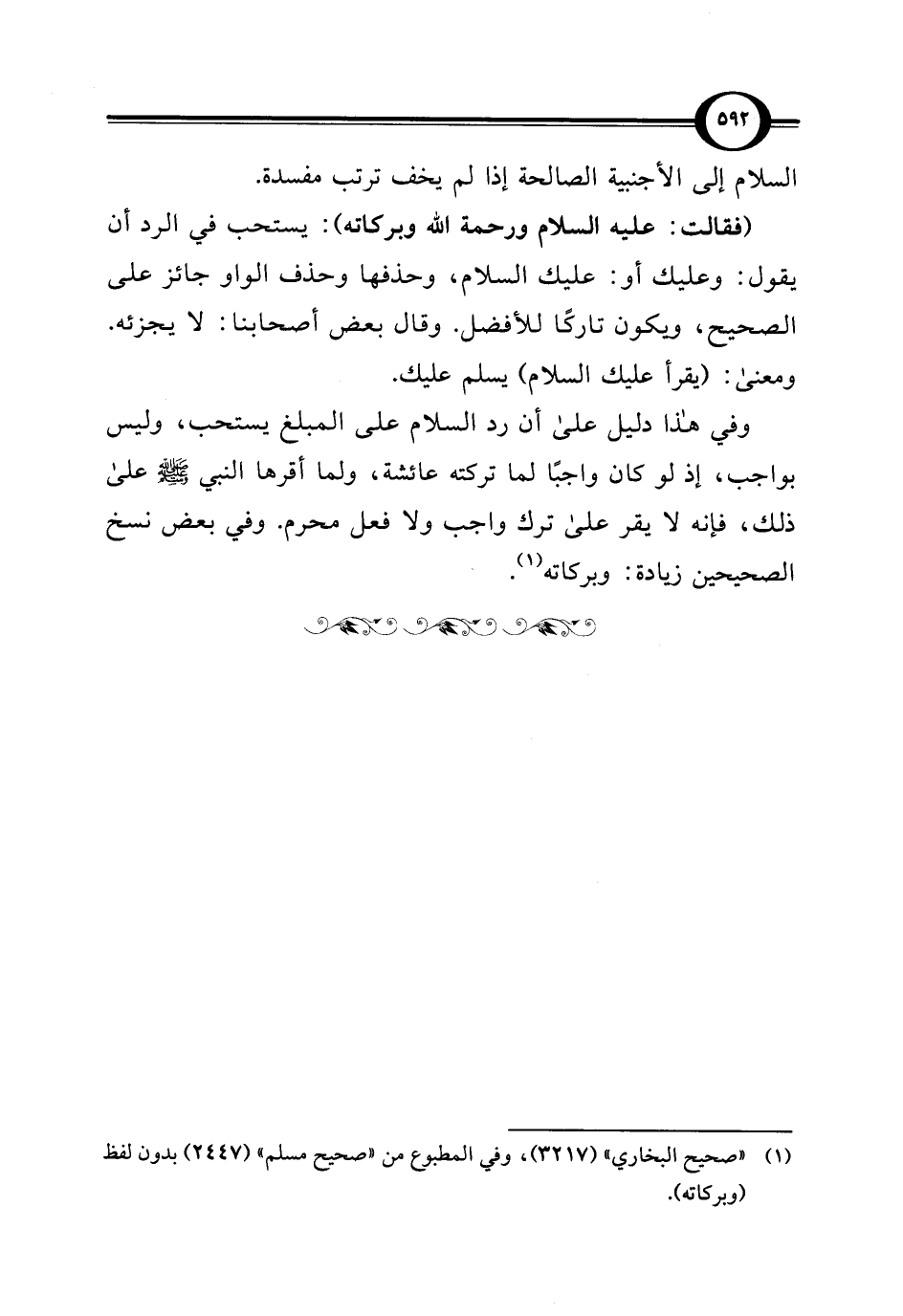 (فقالت: عليه السلام ورحمة اللَّه وبركاته): يستحب في الرد أن يقول: وعليك أو: عليك السلام، وحذفها وحذف الواو جائز على الصحيح، ويكون تاركًا للأفضل. وقال بعض أصحابنا: لا يجزئه. ومعنى: (يقرأ عليك السلام) يسلم عليك.