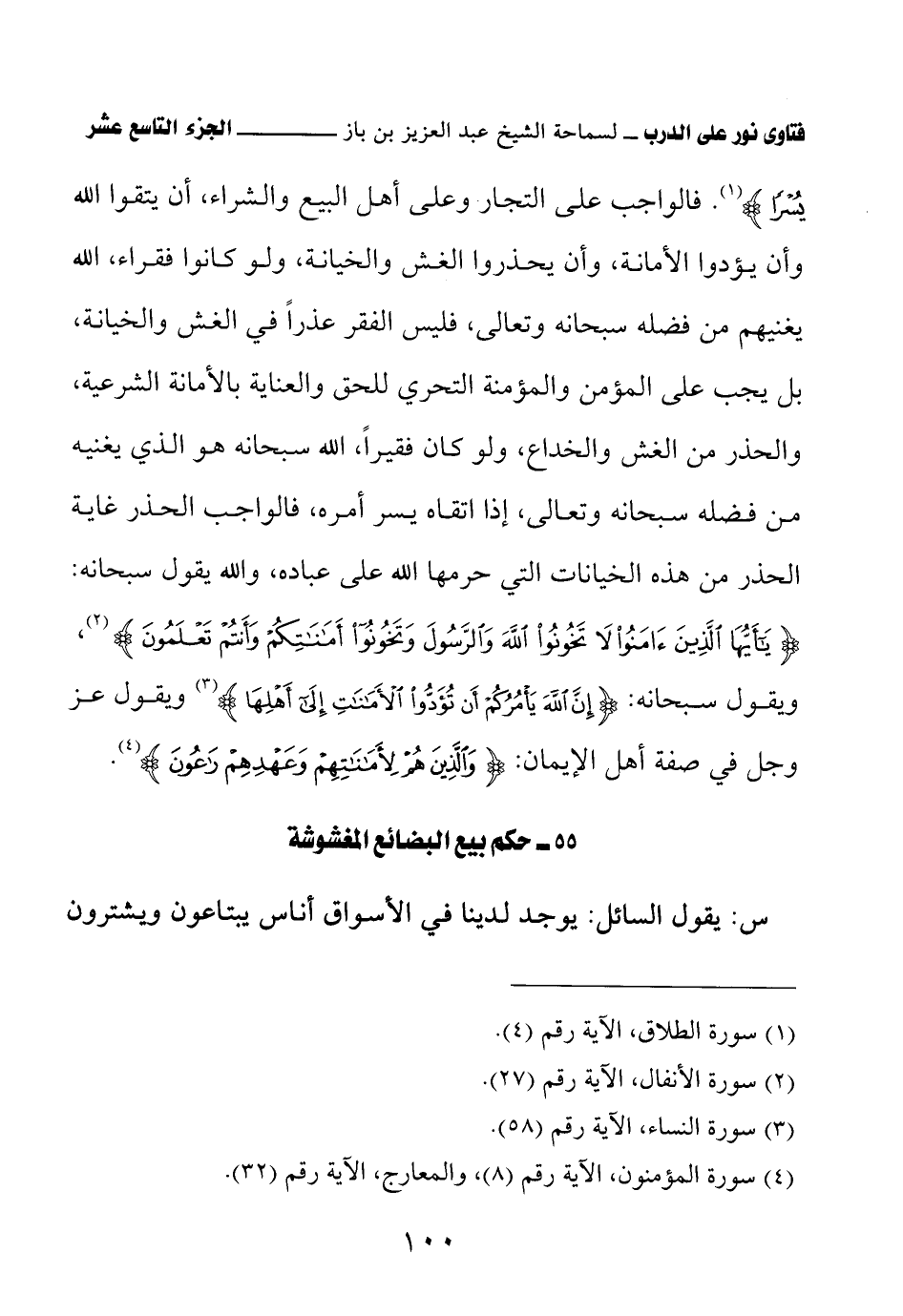 فالواجب على التجار وعلى أهل البيع والشراء، أن يتقوا الله وأن يؤدوا الأمانة، وأن يحذروا الغش والخيانة، ولو كانوا فقراء، الله يغنيهم من فضله سبحانه وتعالى، فليس الفقر عذرًا في الغش والخيانة، بل يجب على المؤمن والمؤمنة التحري للحق والعناية بالأمانة الشرعية، والحذر من الغش والخداع، ولو كان فقيرًا، الله سبحانه هو الذي يغنيه من فضله سبحانه وتعالى، إذا اتقاه يسر أمره، فالواجب الحذر غاية الحذر من هذه الخيانات التي حرمها الله على عباده، والله يقول سبحانه: {يَاأَيُّهَا الَّذِينَ آمَنُوا لاَ تَخُونُوا اللَّهَ وَالرَّسُولَ وَتَخُونُوا أَمَانَاتِكُمْ وَأَنْتُمْ تَعْلَمُونَ}، ويقول سبحانه: {إِنَّ اللَّهَ يَأْمُرُكُمْ أَنْ تُؤَدُّوا الْأَمَانَاتِ إِلَى أَهْلِهَا} ويقول عز وجل في صفة أهل الإيمان: {وَالَّذِينَ هُمْ لِأَمَانَاتِهِمْ وَعَهْدِهِمْ رَاعُونَ}.