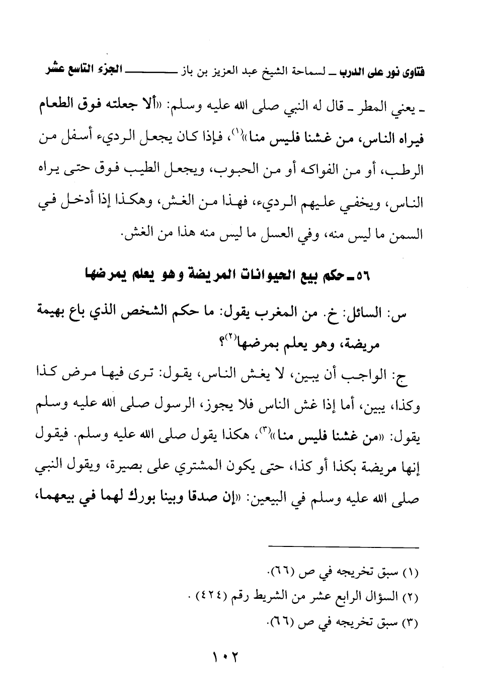 - يعني المطر – قال له النبي صلى الله عليه وسلم: ألا جعلته فوق الطعام فيراه الناس، من غشنا فليس منا» (¬1) فإذا كان يجعل الرديء أسفل من الرطب، أو من الفواكه أو من الحبوب، ويجعل الطيب فوق حتى يراه الناس، ويخفي عليهم الرديء، فهذا من الغش، وهكذا إذا أدخل في السمن ما ليس منه، وفي العسل ما ليس منه هذا من الغش.