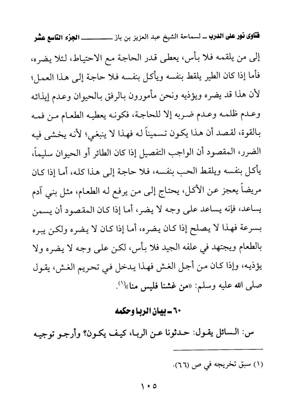 إلى من يلقمه فلا بأس، يعطى قدر الحاجة مع الاحتياط، لئلا يضره، فأما إذا كان الطير يلقط بنفسه ويأكل بنفسه فلا حاجة إلى هذا العمل؛ لأن هذا قد يضره ويؤذيه ونحن مأمورون بالرفق بالحيوان وعدم إيذائه وعدم ظلمه وعدم ضربه إلا للحاجة، فكونه يعطيه الطعام من فمه بالقوة، لقصد أن هذا يكون تسمينًا له فهذا لا ينبغي؛ لأنه يخشى فيه الضرر، المقصود أن الواجب التفصيل إذا كان الطائر أو الحيوان سليمًا، يأكل بنفسه ويلقط الحب بنفسه، فلا حاجة إلى هذا كله، أما إذا كان مريضًا يعجز عن الأكل، يحتاج إلى من يرفع له الطعام، مثل بني آدم يساعد، فإنه يساعد على وجه لا يضر، أما إذا كان المقصود أن يسمن بسرعة فهذا لا يصلح إذا كان يضره، أما إذا كان لا يضره ولكن يبره بالطعام ويجتهد في علفه الجيد فلا بأس، لكن على وجه لا يضره ولا يؤذيه، وإذا كان من أجل الغش فهذا يدخل في تحريم الغش، يقول صلى الله عليه وسلم: «من غشنا فليس منا» (¬1).