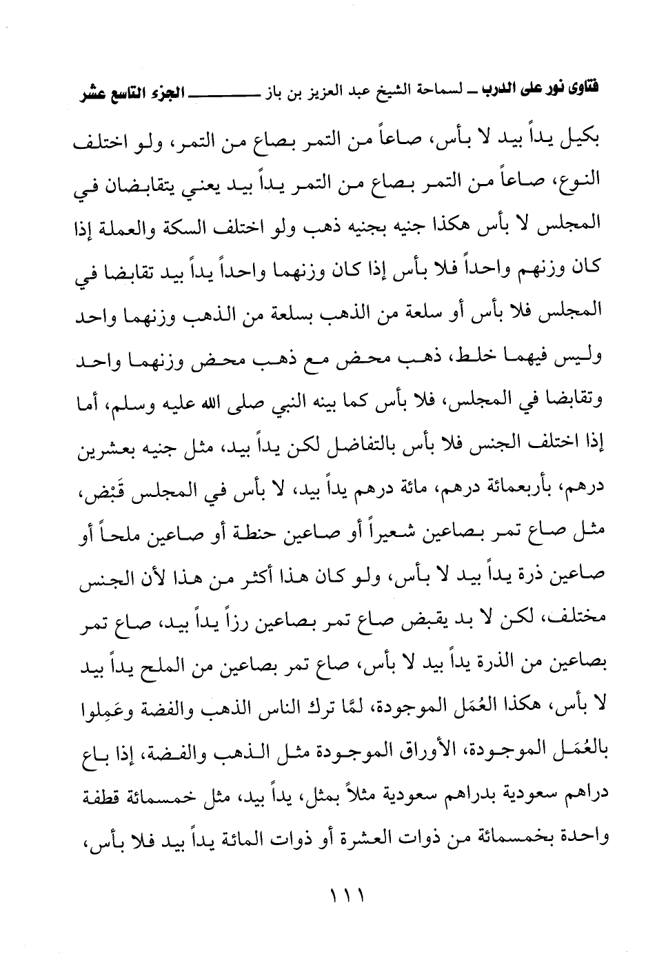 بكيل يدًا بيد لا بأس، صاعًا من التمر بصاع من التمر، ولو اختلف النوع، صاعًا من التمر بصاع من التمر يدًا بيد يعني يتقابضان في المجلس لا بأس هكذا جنيه بجنيه ذهب ولو اختلف السكة والعملة إذا كان وزنهم واحدًا فلا بأس إذا كان وزنهما واحدًا يدًا بيد تقابضا في المجلس فلا بأس أو سلعة من الذهب بسلعة من الذهب وزنهما واحد وليس فيهما خلط، ذهب محض مع ذهب محض وزنهما واحد وتقابضا في المجلس، فلا بأس كما بينه النبي صلى الله عليه وسلم، أما إذا اختلف الجنس فلا بأس بالتفاضل لكن يدًا بيد، مثل جنيه بعشرين درهم، بأربعمائة درهم، مائة درهم يدًا بيد، لا بأس في المجلس قَبْض، مثل صاع تمر بصاعين شعيرًا أو صاعين حنطة أو صاعين ملحًا أو صاعين ذرة يدًا بيد لا بأس، ولو كان هذا أكثر من هذا لأن الجنس مختلف، لكن لا بد يقبض صاع تمر بصاعين رزًا يدًا بيد، صاع تمر بصاعين من الذرة يدًا بيد لا بأس، صاع تمر بصاعين من الملح يدًا بيد لا بأس، هكذا العُمَل الموجودة، لمَّا ترك الناس الذهب والفضة وعَمِلوا بالعُمَل الموجودة، الأوراق الموجودة مثل الذهب والفضة، إذا باع دراهم سعودية بدراهم سعودية مثلاً بمثل، يدًا بيد، مثل خمسمائة قطفة واحدة بخمسمائة من ذوات العشرة أو ذوات المائة يدًا بيد فلا بأس،