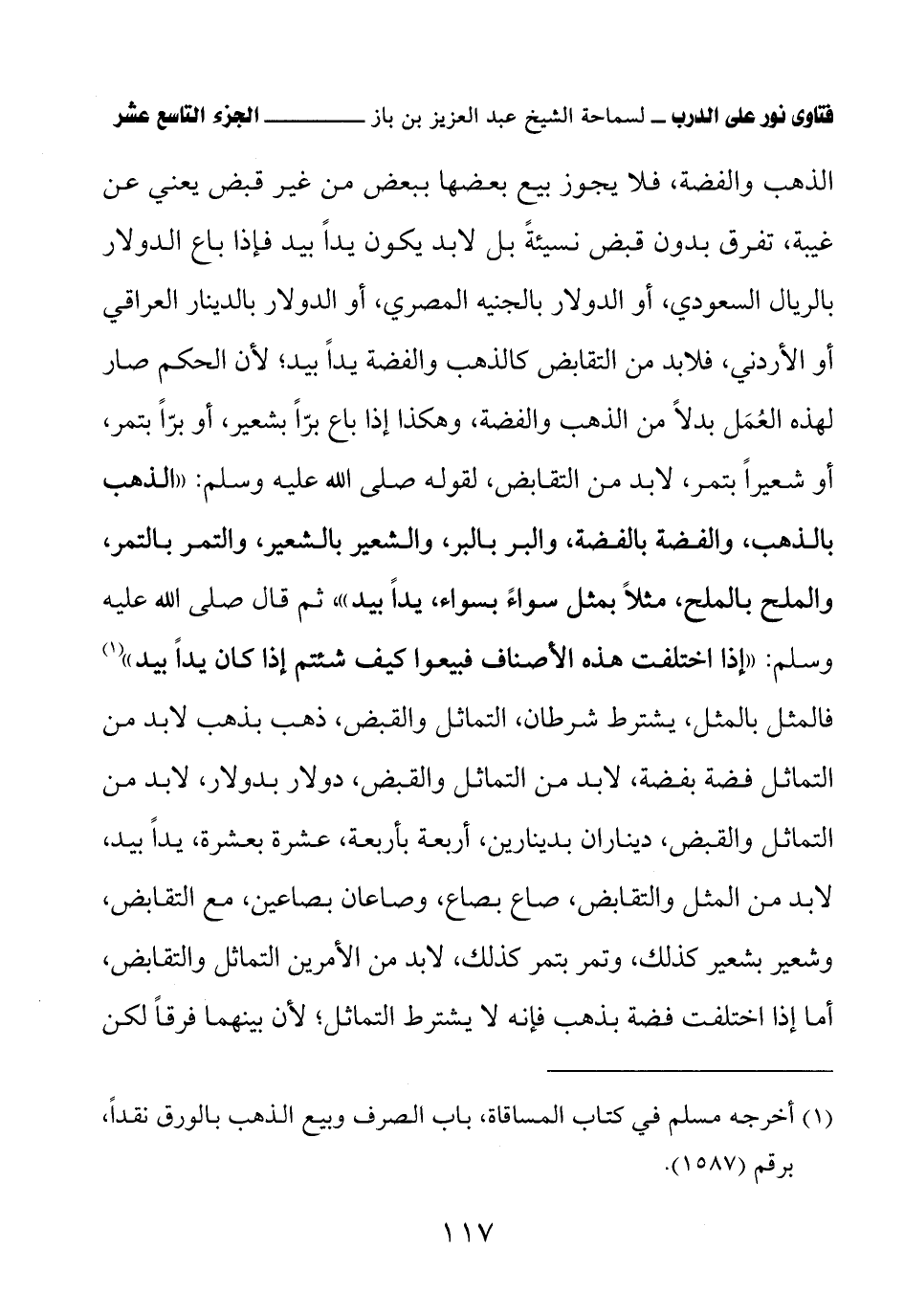 الذهب والفضة، فلا يجوز بيع بعضها ببعض من غير قبض يعني عن غيبة، تفرق بدون قبض نسيئةً بل لا بد يكون يدًا بيد فإذا باع الدولار بالريال السعودي، أو الدولار بالجنيه المصري، أو الدولار بالدينار العراقي أو الأردني، فلا بد من التقابض كالذهب والفضة يدًا بيد؛ لأن الحكم صار لهذه العُمَل بدلاً من الذهب والفضة، وهكذا إذا باع برًّا بشعير، أو برًّا بتمر، أو شعيرًا بتمر، لا بد من التقابض، لقوله صلى الله عليه وسلم: «الذهب بالذهب، والفضة بالفضة، والبر بالبر، والشعير بالشعير، والتمر بالتمر، والملح بالملح، مثلاً بمثل سواءً بسواء، يدًا بيد» (¬1) ثم قال صلى الله عليه وسلم: «إذا اختلفت هذه الأصناف فبيعوا كيف شئتم إذا كان يدًا بيد» (¬2) فالمثل بالمثل، يشترط شرطان، التماثل والقبض، ذهب بذهب لا بد من التماثل فضة بفضة، لا بد من التماثل والقبض، دولار بدولار، لا بد من التماثل والقبض، ديناران بدينارين، أربعة بأربعة، عشرة بعشرة، يدًا بيد، لا بد من المثل والتقابض، صاع بصاع، وصاعان بصاعين، مع التقابض، وشعير بشعير كذلك، وتمر بتمر كذلك، لا بد من الأمرين التماثل والتقابض، أما إذا اختلفت فضة بذهب فإنه لا يشترط التماثل؛ لأن بينهما فرقًا لكن