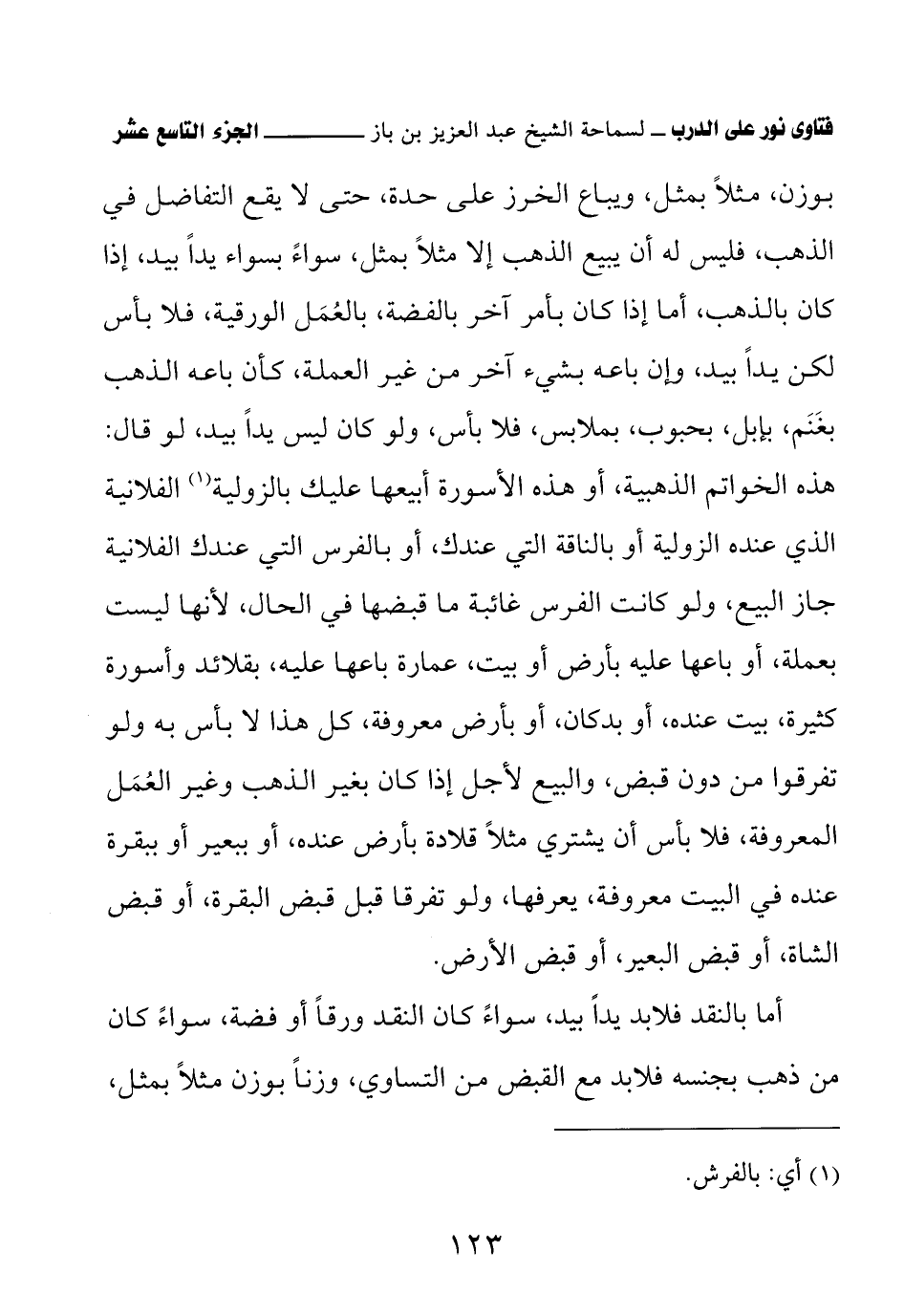 بوزن، مثلاً بمثل، ويباع الخرز على حدة، حتى لا يقع التفاضل في الذهب، فليس له أن يبيع الذهب إلا مثلاً بمثل، سواءً بسواء يدًا بيد، إذا كان بالذهب، أما إذا كان بأمر آخر بالفضة، بالعُمَل الورقية، فلا بأس لكن يدًا بيد، وإن باعه بشيء آخر من غير العملة، كأن باعه الذهب بغَنَم، بإبل، بحبوب، بملابس، فلا بأس، ولو كان ليس يدًا بيد، لو قال: هذه الخواتم الذهبية، أو هذه الأسورة أبيعها عليك بالزولية الفلانية الذي عنده الزولية أو بالناقة التي عندك، أو بالفرس التي عندك الفلانية جاز البيع، ولو كانت الفرس غائبة ما قبضها في الحال، لأنها ليست بعملة، أو باعها عليه بأرض أو بيت، عمارة باعها عليه، بقلائد وأسورة كثيرة، بيت عنده، أو بدكان، أو بأرض معروفة، كل هذا لا بأس به ولو تفرقوا من دون قبض، والبيع لأجل إذا كان بغير الذهب وغير العُمَل المعروفة، فلا بأس أن يشتري مثلاً قلادة بأرض عنده، أو ببعير أو ببقرة عنده في البيت معروفة، يعرفها، ولو تفرقا قبل قبض البقرة، أو قبض الشاة، أو قبض البعير، أو قبض الأرض.