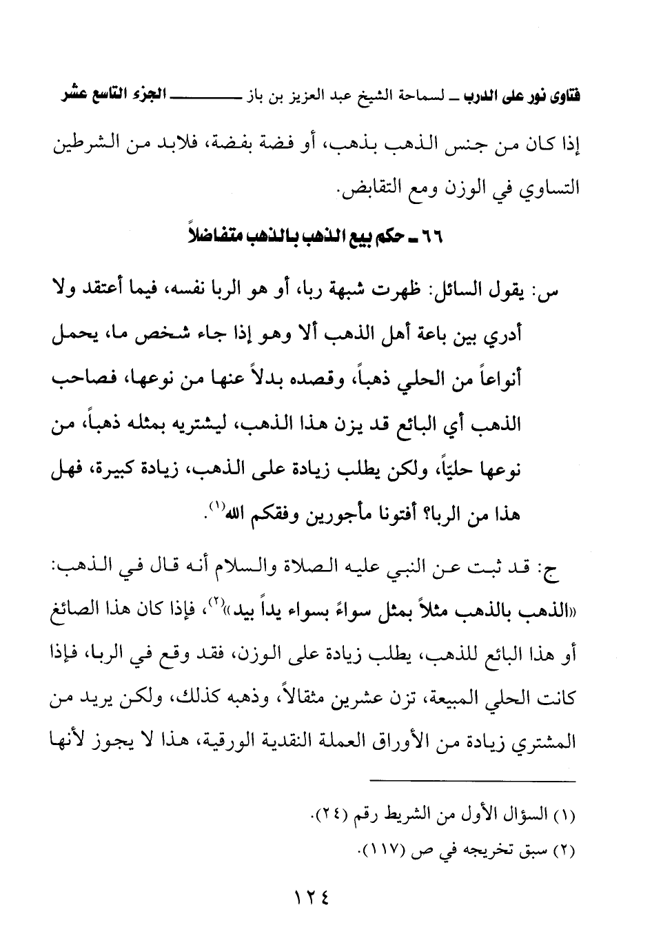 ج: قد ثبت عن النبي عليه الصلاة والسلام أنه قال في الذهب: «الذهب بالذهب مثلاً بمثل سواءً بسواء يدًا بيد» (¬3) فإذا كان هذا الصائغ أو هذا البائع للذهب، يطلب زيادة على الوزن، فقد وقع في الربا، فإذا كانت الحلي المبيعة، تزن عشرين مثقالاً، وذهبه كذلك، ولكن يريد من المشتري زيادة من الأوراق العملة النقدية الورقية، هذا لا يجوز لأنها