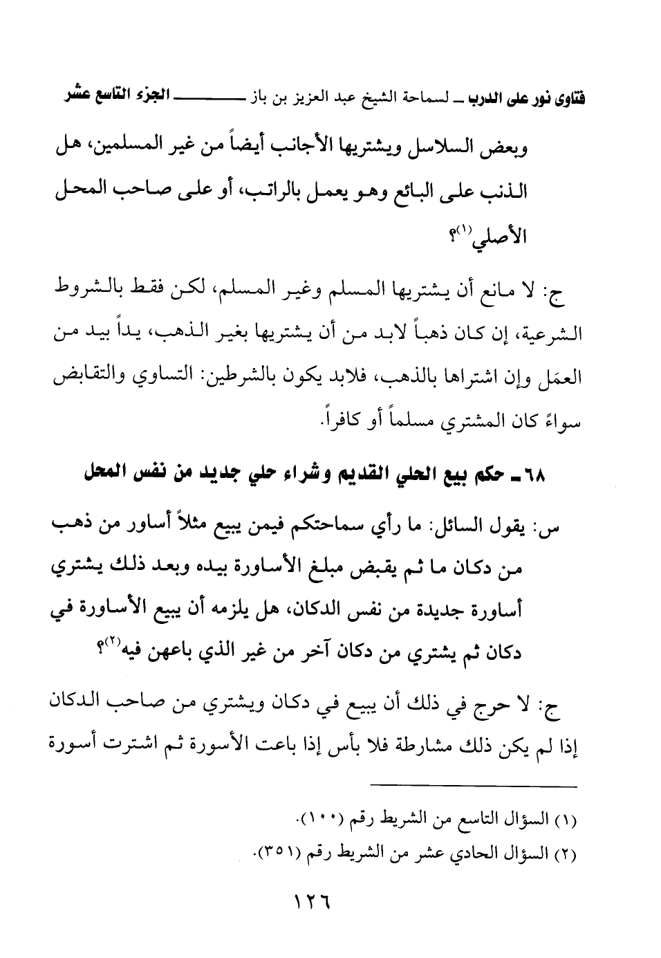س: يقول السائل: ما رأي سماحتكم فيمن يبيع مثلاً أساور من ذهب من دكان ما ثم يقبض مبلغ الأساورة بيده وبعد ذلك يشتري أساورة جديدة من نفس الدكان، هل يلزمه أن يبيع الأساورة في دكان ثم يشتري من دكان آخر من غير الذي باعهن فيه (¬1)؟