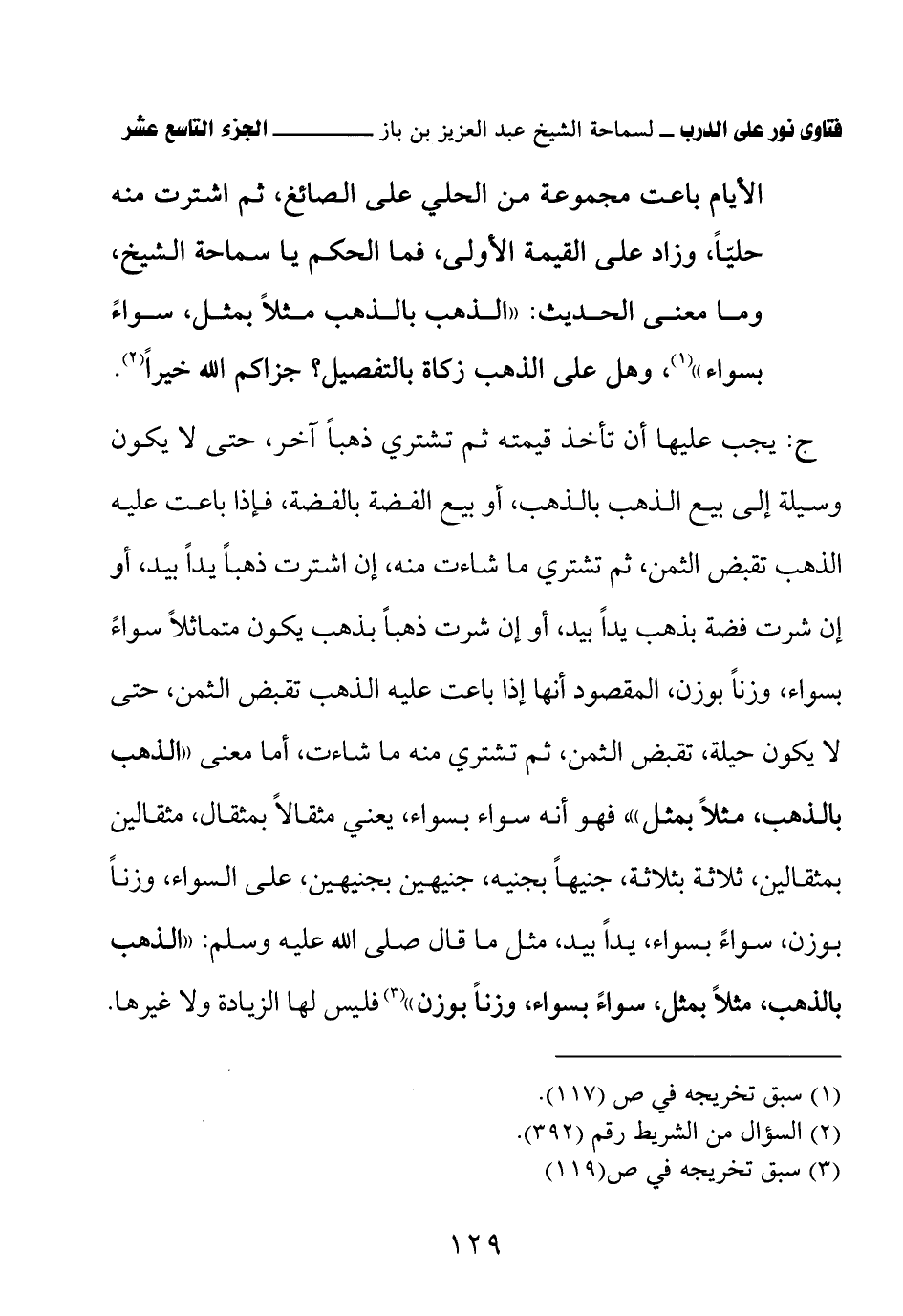 ج: يجب عليها أن تأخذ قيمته ثم تشتري ذهبًا آخر، حتى لا يكون وسيلة إلى بيع الذهب بالذهب، أو بيع الفضة بالفضة، فإذا باعت عليه الذهب تقبض الثمن، ثم تشتري ما شاءت منه، إن اشترت ذهبًا يدًا بيد، أو إن شرت فضة بذهب يدًا بيد، أو إن شرت ذهبًا بذهب يكون متماثلاً سواءً بسواء، وزنًا بوزن، المقصود أنها إذا باعت عليه الذهب تقبض الثمن، حتى لا يكون حيلة، تقبض الثمن، ثم تشتري منه ما شاءت، أما معنى «الذهب بالذهب، مثلاً بمثل» (¬2)، فهو أنه سواء بسواء، يعني مثقالاً بمثقال، مثقالين بمثقالين، ثلاثة بثلاثة، جنيهًا بجنيه، جنيهين بجنيهين، على السواء، وزنًا بوزن، سواءً بسواء، يدًا بيد، مثل ما قال صلى الله عليه وسلم: «الذهب بالذهب، مثلاً بمثل، سواءً بسواء، وزنًا بوزن» (¬3) فليس لها الزيادة ولا غيرها.