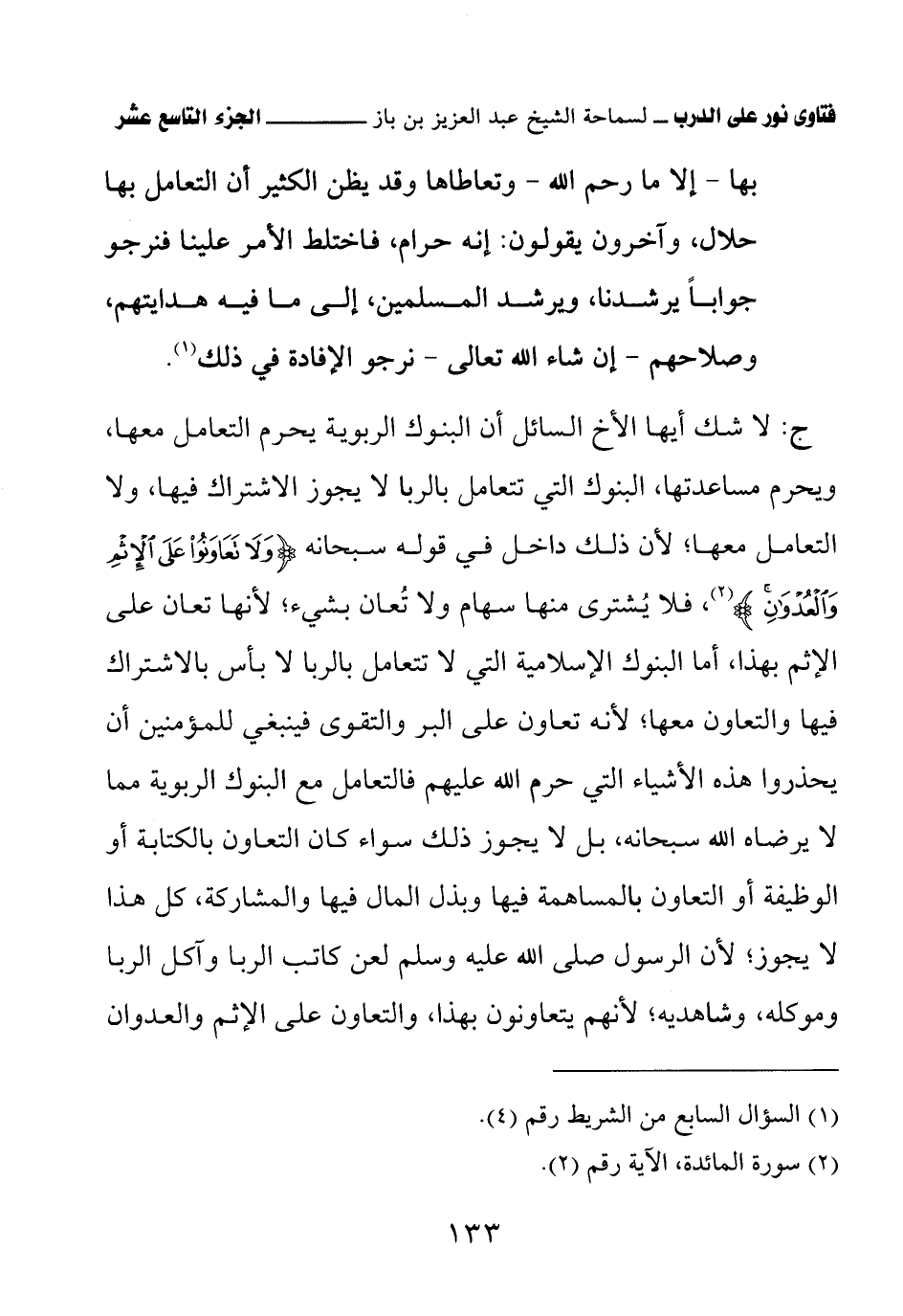 ج: لا شك أيها الأخ السائل أن البنوك الربوية يحرم التعامل معها، ويحرم مساعدتها، البنوك التي تتعامل بالربا لا يجوز الاشتراك فيها، ولا التعامل معها؛ لأن ذلك داخل في قوله سبحانه {وَلاَ تَعَاوَنُوا عَلَى الْإِثْمِ وَالْعُدْوَانِ}، فلا يُشترى منها سهام ولا تُعان بشيء؛ لأنها تعان على الإثم بهذا، أما البنوك الإسلامية التي لا تتعامل بالربا لا بأس بالاشتراك فيها والتعاون معها؛ لأنه تعاون على البر والتقوى فينبغي للمؤمنين أن يحذروا هذه الأشياء التي حرم الله عليهم فالتعامل مع البنوك الربوية مما لا يرضاه الله سبحانه، بل لا يجوز ذلك سواء كان التعاون بالكتابة أو الوظيفة أو التعاون بالمساهمة فيها وبذل المال فيها والمشاركة، كل هذا لا يجوز؛ لأن الرسول صلى الله عليه وسلم لعن كاتب الربا وآكل الربا وموكله، وشاهديه، لأنهم يتعاونون بهذا، والتعاون على الإثم والعدوان