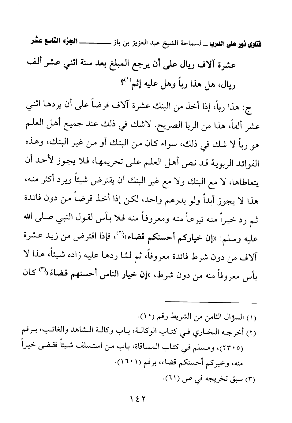 ج: هذا ربًا، إذا أخذ من البنك عشرة آلاف قرضًا على أن يردها اثني عشر ألفًا، هذا من الربا الصريح، لا شك في ذلك عند جميع أهل العلم هو ربًا لا شك في ذلك، سواء كان من البنك أو من غير البنك، وهذه الفوائد الربوية قد نص أهل العلم على تحريمها، فلا يجوز لأحد أن يتعاطاها، لا مع البنك ولا مع غير البنك أن يقترض شيئًا ويرد أكثر منه، هذا لا يجوز أبدًا ولو بدرهم واحد، لكن إذا أخذ قرضًا من دون فائدة ثم رد خيرًا منه تبرعًا منه ومعروفًا منه فلا بأس لقول النبي صلى الله عليه وسلم: «إن خياركم أحسنكم قضاء» (¬2) فإذا اقترض من زيد عشرة آلاف من دون شرط فائدة معروفًا، ثم لمَّا ردها عليه زاده شيئًا، هذا لا بأس معروفًا منه من دون شرط، «إن خيار الناس أحسنهم قضاءً» (¬3) كان