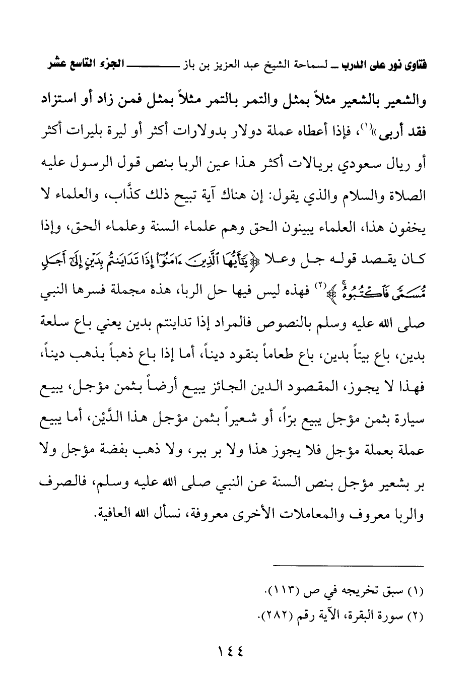 والشعير بالشعير مثلاً بمثل والتمر بالتمر مثلاً بمثل فمن زاد أو استزاد فقد أربى» (¬1) فإذا أعطاه عملة دولار بدولارات أكثر أو ليرة بليرات أكثر أو ريال سعودي بريالات أكثر هذا عين الربا بنص قول الرسول عليه الصلاة والسلام والذي يقول: إن هناك آية تبيح ذلك كذَّاب، والعلماء لا يخفون هذا، العلماء يبينون الحق وهم علماء السنة وعلماء الحق، وإذا كان يقصد قوله جل وعلا {يَاأَيُّهَا الَّذِينَ آمَنُوا إِذَا تَدَايَنْتُمْ بِدَيْنٍ إِلَى أَجَلٍ مُسَمًّى فَاكْتُبُوهُ} فهذه ليس فيها حل الربا، هذه مجملة فسرها النبي صلى الله عليه وسلم بالنصوص فالمراد إذا تداينتم بدين يعني باع سلعة بدين، باع بيتًا بدين، باع طعامًا بنقود دينًا، أما إذا باع ذهبًا بذهب دينًا، فهذا لا يجوز، المقصود الدين الجائز يبيع أرضًا بثمن مؤجل، يبيع سيارة بثمن مؤجل يبيع برًّا، أو شعيرًا بثمن مؤجل هذا الدَّيْن، أما يبيع عملة بعملة مؤجل فلا يجوز هذا ولا بر ببر، ولا ذهب بفضة مؤجل ولا بر بشعير مؤجل بنص السنة عن النبي صلى الله عليه وسلم، فالصرف والربا معروف والمعاملات الأخرى معروفة، نسأل الله العافية.