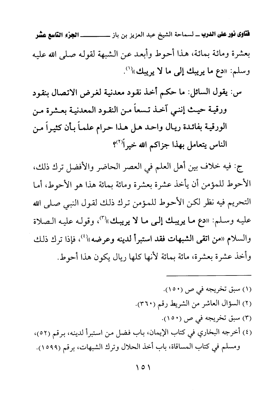 ج: فيه خلاف بين أهل العلم في العصر الحاضر والأفضل ترك ذلك، الأحوط للمؤمن أن يأخذ عشرة بعشرة ومائة بمائة هذا هو الأحوط، أما التحريم فيه نظر لكن الأحوط للمؤمن ترك ذلك لقول النبي صلى الله عليه وسلم: «دع ما يريبك إلى ما لا يريبك» (¬3) وقوله عليه الصلاة والسلام «من اتقى الشبهات فقد استبرأ لدينه وعرضه» (¬4) فإذا ترك ذلك وأخذ عشرة بعشرة، مائة بمائة لأنها كلها ريال يكون هذا أحوط.
