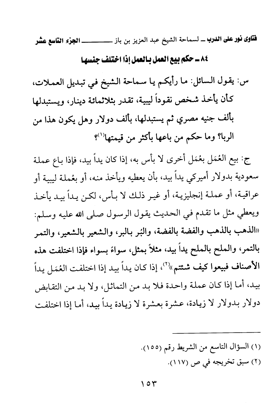 ج: بيع العُمَل بعُمَل أخرى لا بأس به، إذا كان يدًا بيد، فإذا باع عملة سعودية بدولار أميركي يدًا بيد، بأن يعطيه ويأخذ منه، أو بعُملة ليبية أو عراقية، أو عملة إنجليزية، أو غير ذلك لا بأس، لكن يدًا بيد يأخذ ويعطي مثل ما تقدم في الحديث يقول الرسول صلى الله عليه وسلم: «الذهب بالذهب والفضة بالفضة، والبُر بالبر، والشعير بالشعير، والتمر بالتمر، والملح بالملح يدًا بيد، مثلاً بمثل، سواءً بسواء فإذا اختلفت هذه الأصناف فبيعوا كيف شئتم» (¬3) إذا كان يدًا بيد إذا اختلفت العُمَل يدًا بيد، أما إذا كان عملة واحدة فلا بد من التماثل، ولا بد من التقابض دولار بدولار لا زيادة، عشرة بعشرة لا زيادة يدًا بيد، أما إذا اختلفت