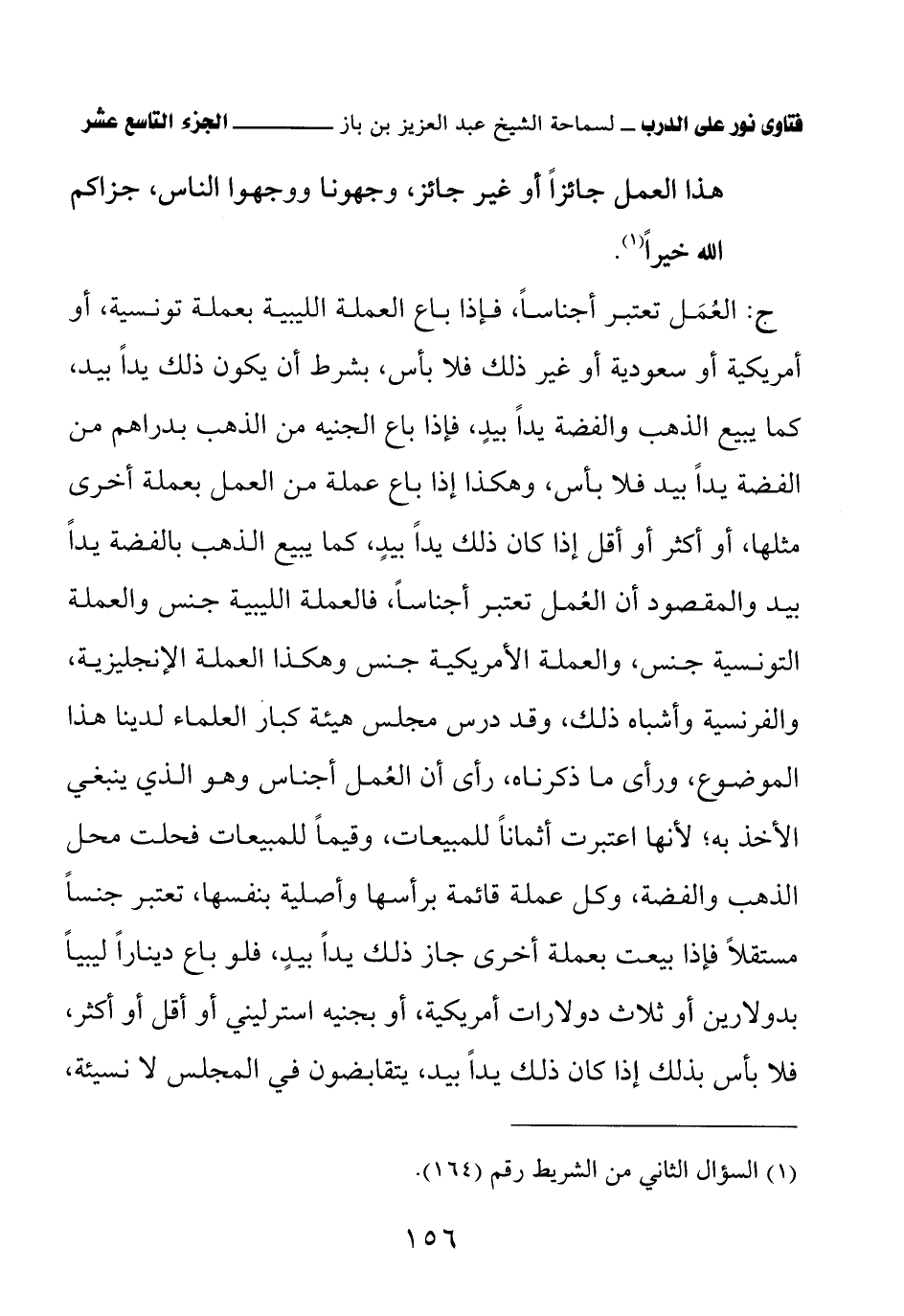 ج: العُمَل تعتبر أجناسًا، فإذا باع العملة الليبية بعملة تونسية، أو أمريكية أو سعودية أو غير ذلك فلا بأس، بشرط أن يكون ذلك يدًا بيد، كما يبيع الذهب والفضة يدًا بيدٍ، فإذا باع الجنيه من الذهب بدراهم من الفضة يدًا بيد فلا بأس، وهكذا إذا باع عملة من العمل بعملة أخرى مثلها، أو أكثر أو أقل إذا كان ذلك يدًا بيدٍ، كما يبيع الذهب بالفضة يدًا بيد والمقصود أن العُمل تعتبر أجناسًا، فالعملة الليبية جنس والعملة التونسية جنس، والعملة الأمريكية جنس وهكذا العملة الإنجليزية، والفرنسية وأشباه ذلك، وقد درس مجلس هيئة كبار العلماء لدينا هذا الموضوع، ورأى ما ذكرناه، رأى أن العُمل أجناس وهو الذي ينبغي الأخذ به؛ لأنها اعتبرت أثمانًا للمبيعات، وقيمًا للمبيعات فحلت محل الذهب والفضة، وكل عملة قائمة برأسها وأصلية بنفسها، تعتبر جنسًا مستقلاً فإذا بيعت بعملة أخرى جاز ذلك يدًا بيدٍ، فلو باع دينارًا ليبيًا بدولارين أو ثلاث دولارات أمريكية، أو بجنيه إسترليني أو أقل أو أكثر، فلا بأس بذلك إذا كان ذلك يدًا بيد، يتقابضون في المجلس لا نسيئة،