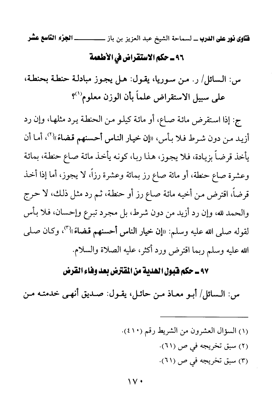 ج: إذا استقرض مائة صاع، أو مائة كيلو من الحنطة يرد مثلها، وإن رد أزيد من دون شرط فلا بأس، «إن خيار الناس أحسنهم قضاءً» (¬2) أما أن يأخذ قرضًا بزيادة، فلا يجوز، هذا ربا، كونه يأخذ مائة صاع حنطة، بمائة وعشرة صاع حنطة، أو مائة صاع رز بمائة وعشرة رزًا، لا يجوز، أما إذا أخذ قرضًا، اقترض من أخيه مائة صاع رز أو حنطة، ثم رد مثل ذلك، لا حرج والحمد لله، وإن رد أزيد من دون شرط، بل مجرد تبرع وإحسان، فلا بأس لقوله صلى الله عليه وسلم: «إن خيار الناس أحسنهم قضاءً» (¬3) وكان صلى الله عليه وسلم ربما اقترض ورد أكثر، عليه الصلاة والسلام.