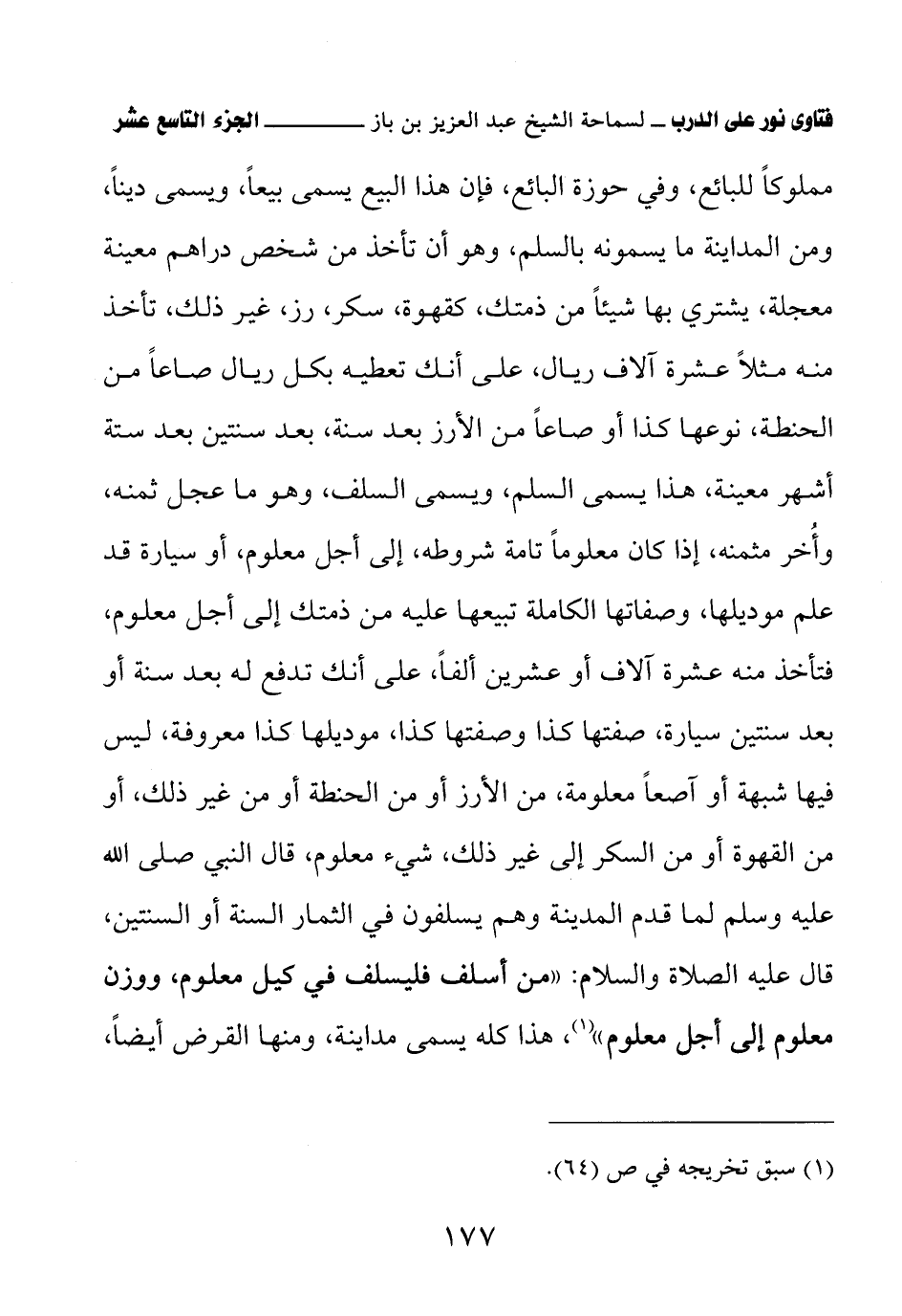 مملوكًا للبائع، وفي حوزة البائع، فإن هذا البيع يسمى بيعًا، ويسمى دينًا، ومن المداينة ما يسمونه بالسلم، وهو أن تأخذ من شخص دراهم معينة معجلة، يشتري بها شيئًا من ذمتك، كقهوة، سكر، رز، غير ذلك، تأخذ منه مثلاً عشرة آلاف ريال، على أنك تعطيه بكل ريال صاعًا من الحنطة، نوعها كذا أو صاعًا من الأرز بعد سنة، بعد سنتين بعد ستة أشهر معينة، هذا يسمى السلم، ويسمى السلف، وهو ما عجل ثمنه، وأُخر مثمنه، إذا كان معلومًا تامة شروطه، إلى أجل معلوم، أو سيارة قد علم موديلها، وصفاتها الكاملة تبيعها عليه من ذمتك إلى أجل معلوم، فتأخذ منه عشرة آلاف أو عشرين ألفًا، على أنك تدفع له بعد سنة أو بعد سنتين سيارة، صفتها كذا وصفتها كذا، موديلها كذا معروفة، ليس فيها شبهة أو آصعًا معلومة، من الأرز أو من الحنطة أو من غير ذلك، أو من القهوة أو من السكر إلى غير ذلك، شيء معلوم، قال النبي صلى الله عليه وسلم لما قدم المدينة وهم يسلفون في الثمار السنة أو السنتين، قال عليه الصلاة والسلام: «من أسلف فليسلف في كيل معلوم، ووزن معلوم إلى أجل معلوم» (¬1) هذا كله يسمى مداينة، ومنها القرض أيضًا،