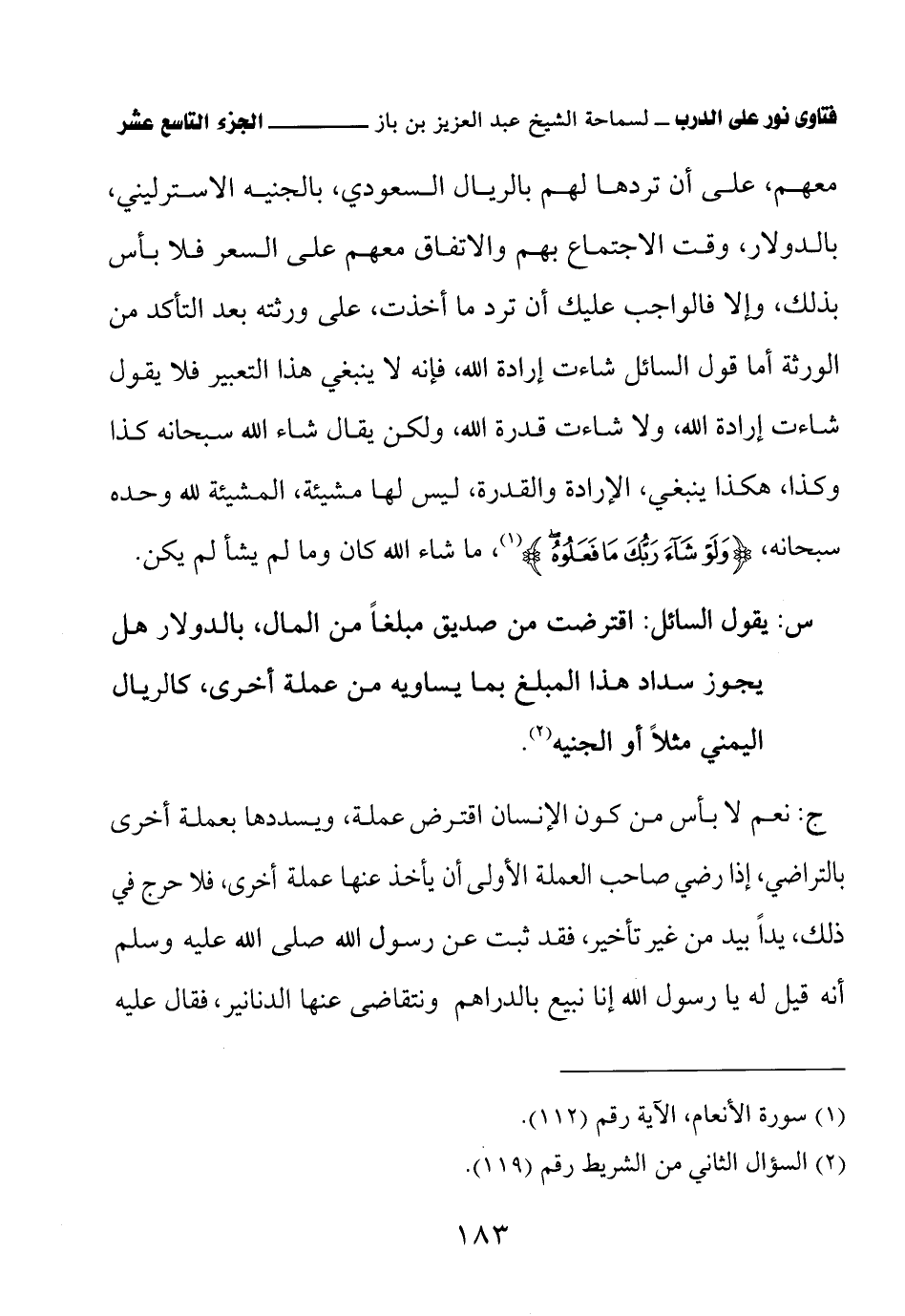 معهم، على أن تردها لهم بالريال السعودي، بالجنيه الإسترليني، بالدولار، وقت الاجتماع بهم والاتفاق معهم على السعر فلا بأس بذلك، وإلا فالواجب عليك أن ترد ما أخذت، على ورثته بعد التأكد من الورثة أما قول السائل شاءت إرادة الله، فإنه لا ينبغي هذا التعبير فلا يقول شاءت إرادة الله، ولا شاءت قدرة الله، ولكن يقال شاء الله سبحانه كذا وكذا، هكذا ينبغي، الإرادة والقدرة، ليس لها مشيئة، المشيئة لله وحده سبحانه، {وَلَوْ شَاءَ رَبُّكَ مَا فَعَلُوهُ}، ما شاء الله كان وما لم يشأ لم يكن.