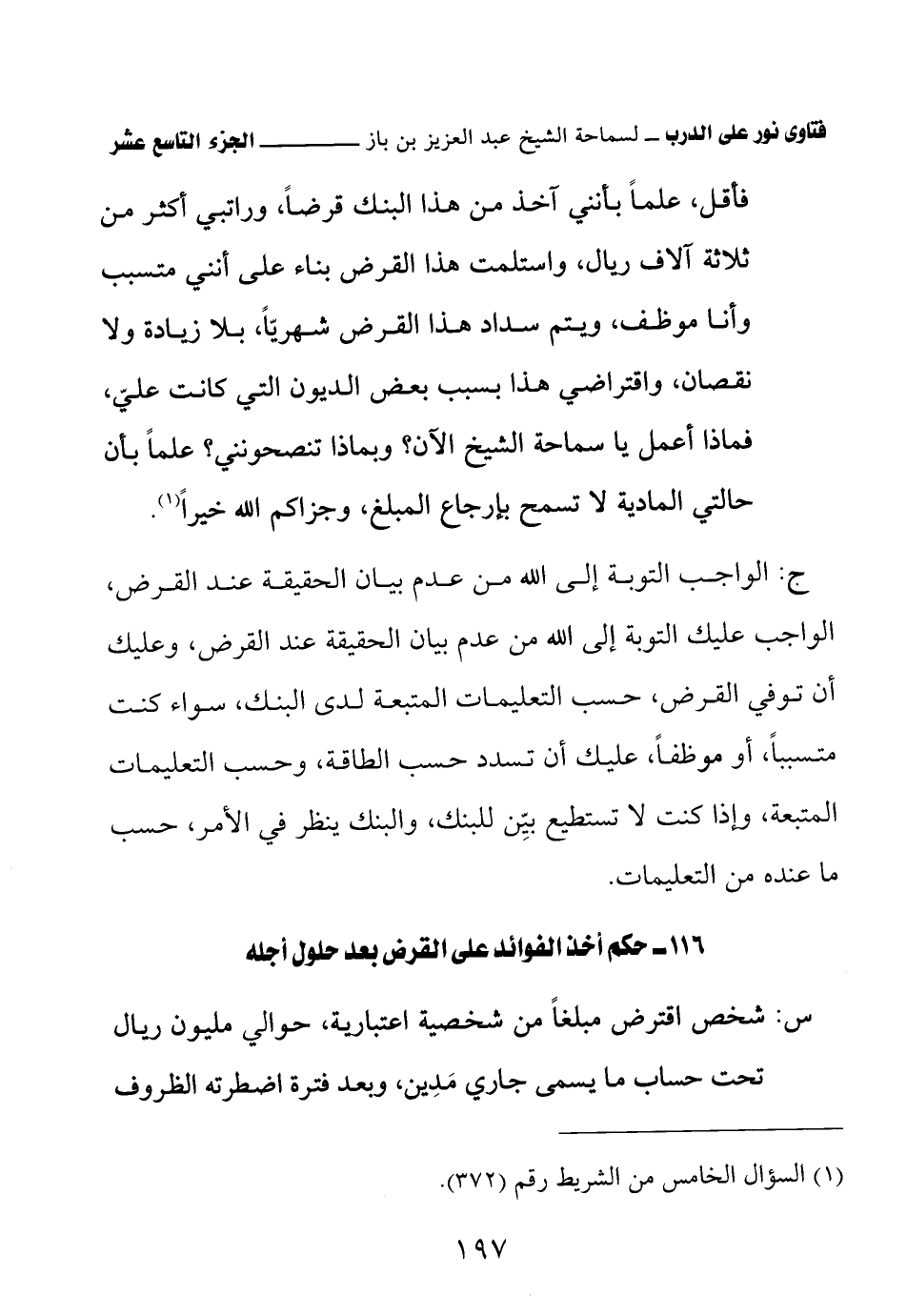 فأقل، علمًا بأنني آخذ من هذا البنك قرضًا، وراتبي أكثر من ثلاثة آلاف ريال، واستلمت هذا القرض بناء على أنني متسبب وأنا موظف، ويتم سداد هذا القرض شهريًّا، بلا زيادة ولا نقصان، واقتراضي هذا بسبب بعض الديون التي كانت عليّ، فماذا أعمل يا سماحة الشيخ الآن؟ وبماذا تنصحونني؟ علمًا بأن حالتي المادية لا تسمح بإرجاع المبلغ، وجزاكم الله خيرًا (¬1).