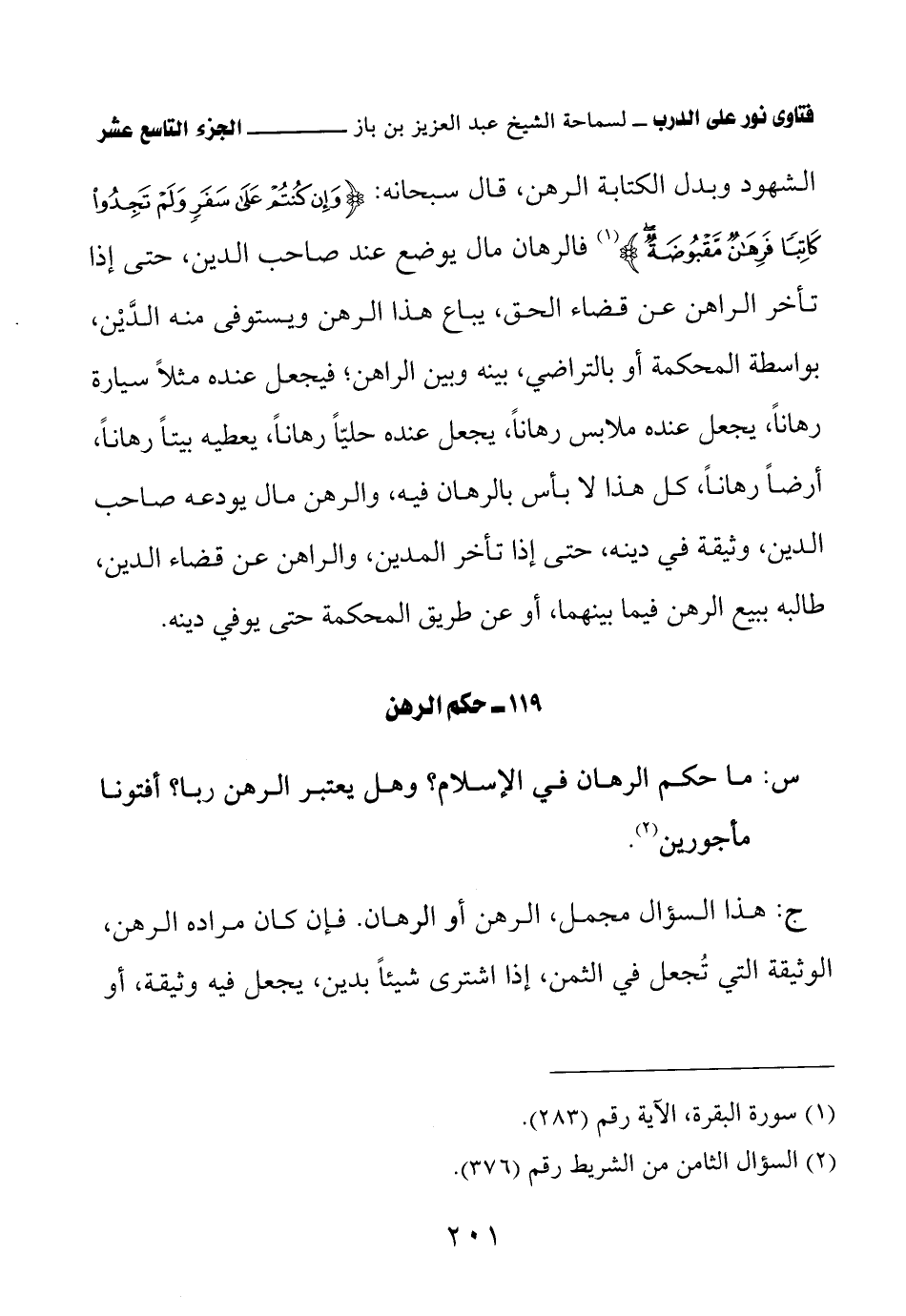 الشهود وبدل الكتابة الرهن، قال سبحانه: {وَإِنْ كُنْتُمْ عَلَى سَفَرٍ وَلَمْ تَجِدُوا كَاتِبًا فَرِهَانٌ مَقْبُوضَةٌ} فالرهان مال يوضع عند صاحب الدين، حتى إذا تأخر الراهن عن قضاء الحق، يباع هذا الرهن ويستوفى منه الدَّيْن، بواسطة المحكمة أو بالتراضي، بينه وبين الراهن؛ فيجعل عنده مثلاً سيارة رهانًا، يجعل عنده ملابس رهانًا، يجعل عنده حليًّا رهانًا، يعطيه بيتًا رهانًا، أرضًا رهانًا، كل هذا لا بأس بالرهان فيه، والرهن مال يودعه صاحب الدين، وثيقة في دينه، حتى إذا تأخر المدين، والراهن عن قضاء الدين، طالبه ببيع الرهن فيما بينهما، أو عن طريق المحكمة حتى يوفي دينه.