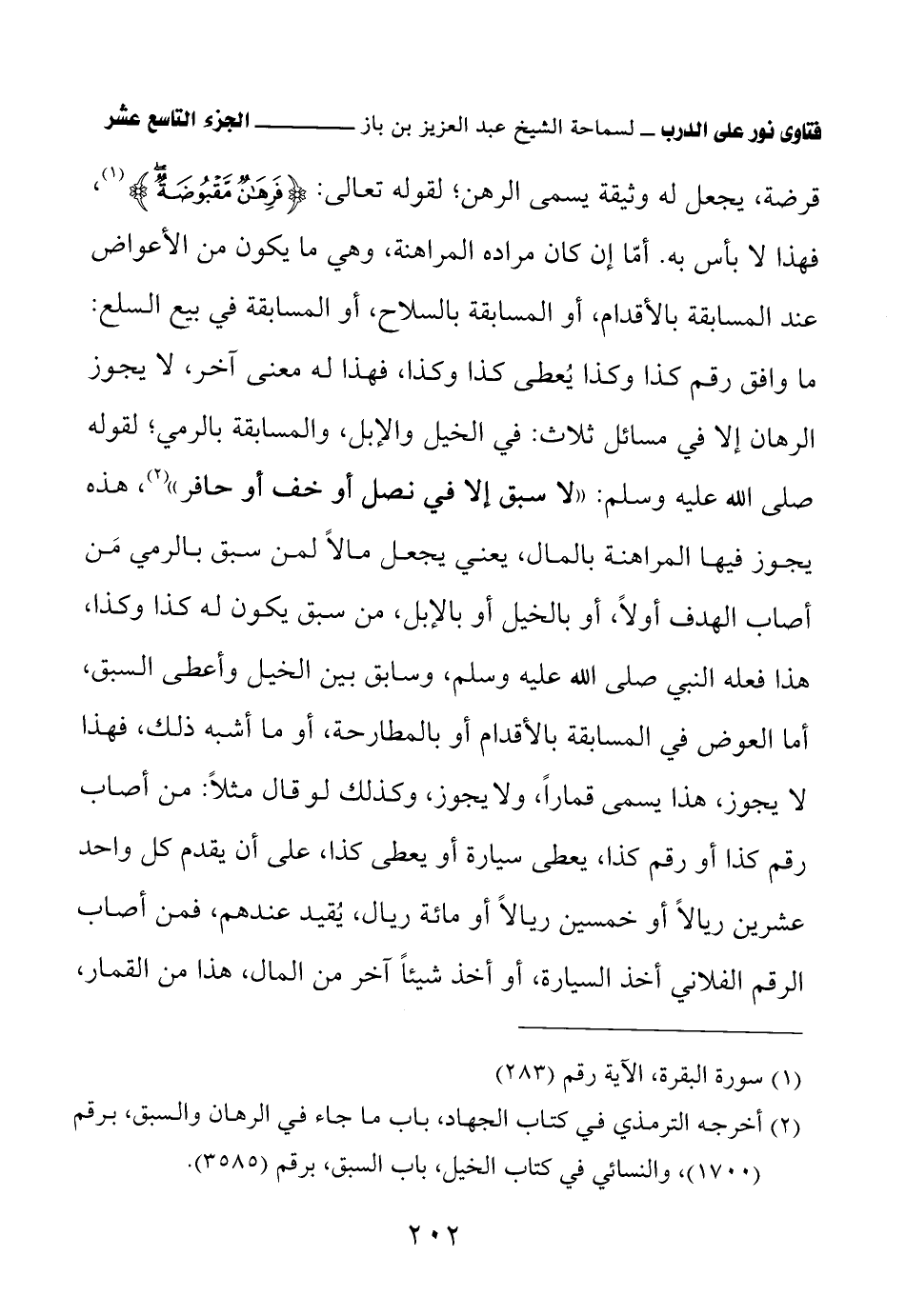 قرضة، يجعل له وثيقة يسمى الرهن؛ لقوله تعالى: {فَرِهَانٌ مَقْبُوضَةٌ}، فهذا لا بأس به. أمّا إن كان مراده المراهنة، وهي ما يكون من الأعواض عند المسابقة بالأقدام، أو المسابقة بالسلاح، أو المسابقة في بيع السلع: ما وافق رقم كذا وكذا يُعطى كذا وكذا، فهذا له معنى آخر، لا يجوز الرهان إلا في مسائل ثلاث: في الخيل والإبل، والمسابقة بالرمي؛ لقوله صلى الله عليه وسلم: «لا سبق إلا في نصل أو خف أو حافر» (¬1) هذه يجوز فيها المراهنة بالمال، يعني يجعل مالاً لمن سبق بالرمي مَن أصاب الهدف أولاً، أو بالخيل أو بالإبل، من سبق يكون له كذا وكذا، هذا فعله النبي صلى الله عليه وسلم، وسابق بين الخيل وأعطى السبق، أما العوض في المسابقة بالأقدام أو بالمطارحة، أو ما أشبه ذلك، فهذا لا يجوز، هذا يسمى قمارًا، ولا يجوز، وكذلك لو قال مثلا: من أصاب رقم كذا أو رقم كذا، يعطى سيارة أو يعطى كذا، على أن يقدم كل واحد عشرين ريالاً أو خمسين ريالاً أو مائة ريال، يُقيد عندهم، فمن أصاب الرقم الفلاني أخذ السيارة، أو أخذ شيئًا آخر من المال، هذا من القمار،