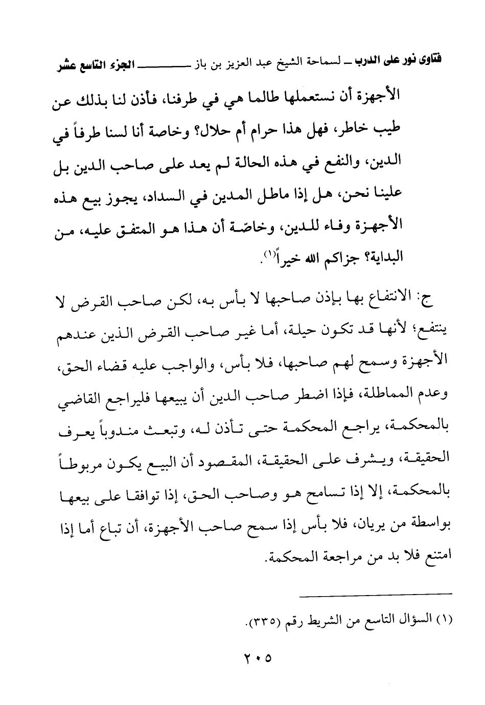ج: الانتفاع بها بإذن صاحبها لا بأس به، لكن صاحب القرض لا ينتفع؛ لأنها قد تكون حيلة، أما غير صاحب القرض الذين عندهم الأجهزة وسمح لهم صاحبها، فلا بأس، والواجب عليه قضاء الحق، وعدم المماطلة، فإذا اضطر صاحب الدين أن يبيعها فليراجع القاضي بالمحكمة، يراجع المحكمة حتى تأذن له، وتبعث مندوبًا يعرف الحقيقة، ويشرف على الحقيقة، المقصود أن البيع يكون مربوطًا بالمحكمة، إلا إذا تسامح هو وصاحب الحق، إذا توافقا على بيعها بواسطة من يريان، فلا بأس إذا سمح صاحب الأجهزة، أن تباع أما إذا امتنع فلا بد من مراجعة المحكمة.