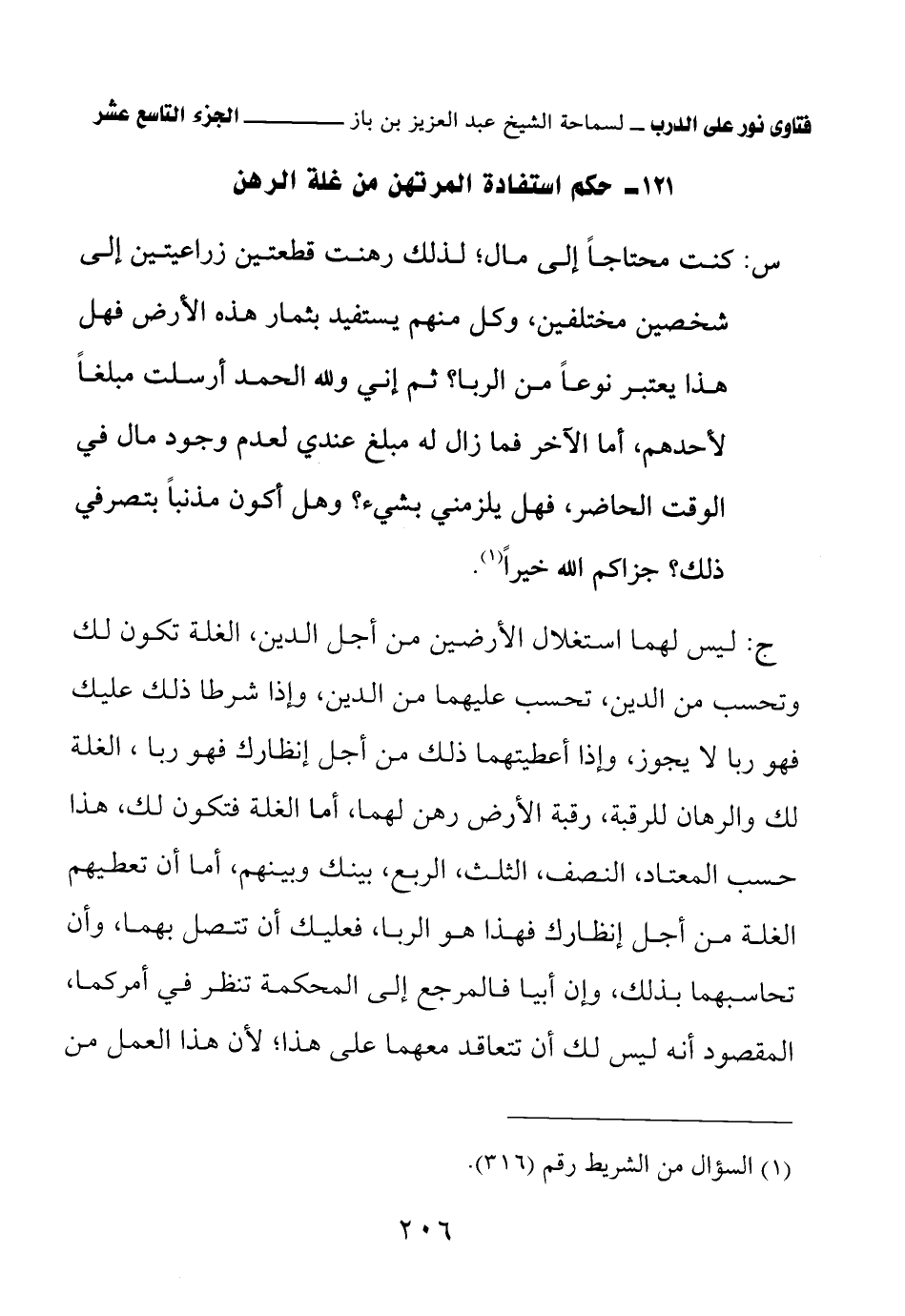 ج: ليس لهما استغلال الأرضين من أجل الدين، الغلة تكون لك وتحسب من الدين، تحسب عليهما من الدين، وإذا شرطا ذلك عليك فهو ربا لا يجوز، وإذا أعطيتهما ذلك من أجل إنظارك فهو ربا، الغلة لك والرهان للرقبة، رقبة الأرض رهن لهما، أما الغلة فتكون لك، هذا حسب المعتاد، النصف، الثلث، الربع، بينك وبينهم، أما أن تعطيهم الغلة من أجل إنظارك فهذا هو الربا، فعليك أن تتصل بهما، وأن تحاسبهما بذلك، وإن أبيا فالمرجع إلى المحكمة تنظر في أمركما، المقصود أنه ليس لك أن تتعاقد معهما على هذا؛ لأن هذا العمل من