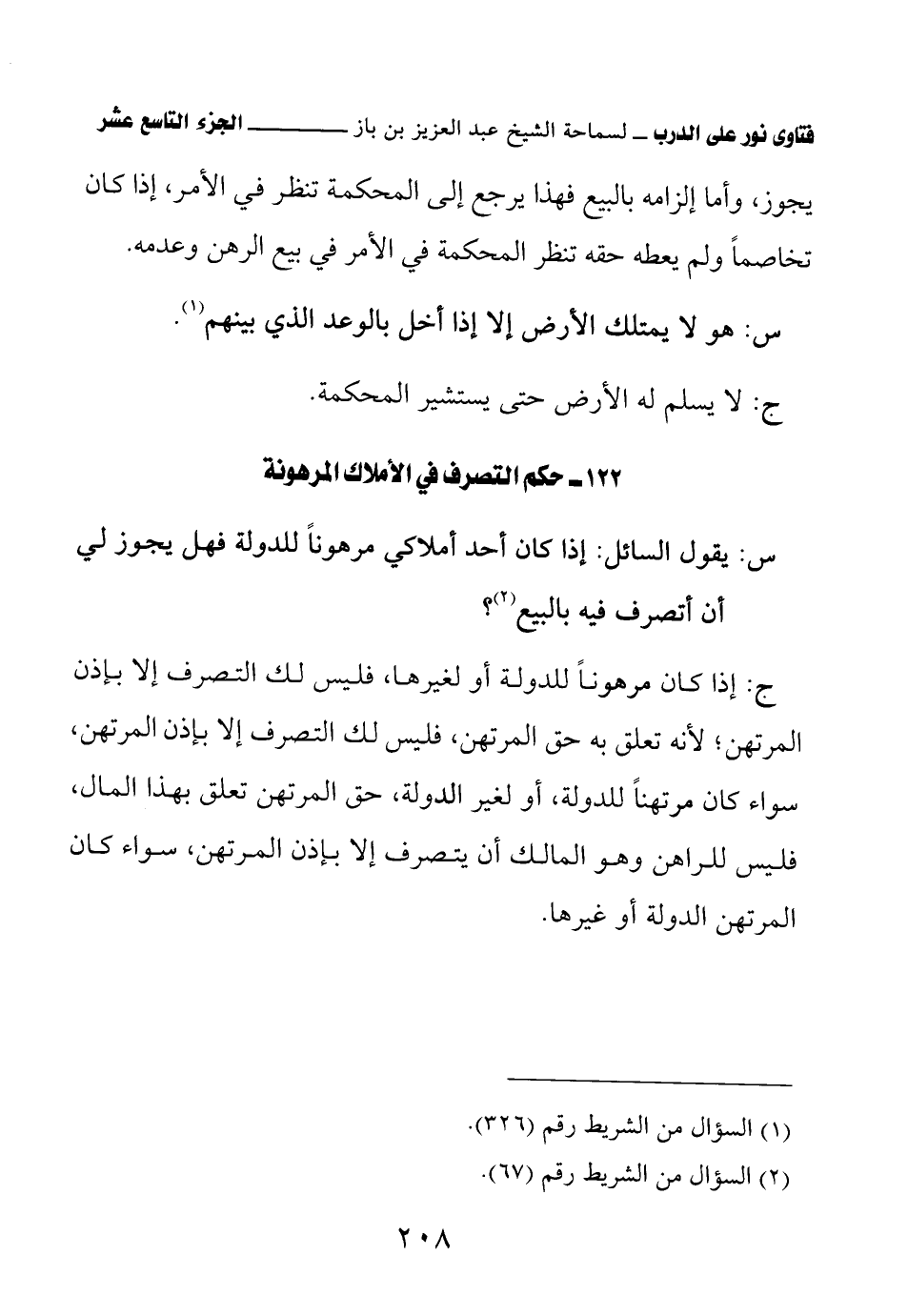 ج: إذا كان مرهونًا للدولة أو لغيرها، فليس لك التصرف إلا بإذن المرتهن؛ لأنه تعلق به حق المرتهن، فليس لك التصرف إلا بإذن المرتهن، سواء كان مرتهنًا للدولة، أو لغير الدولة، حق المرتهن تعلق بهذا المال، فليس للراهن وهو المالك أن يتصرف إلا بإذن المرتهن، سواء كان المرتهن الدولة أو غيرها.