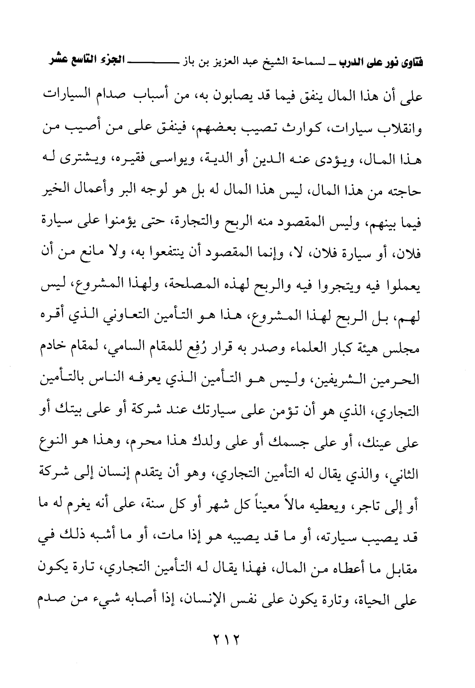 على أن هذا المال ينفق فيما قد يصابون به، من أسباب صدام السيارات وانقلاب سيارات، كوارث تصيب بعضهم، فينفق على من أصيب من هذا المال، ويؤدي عنه الدين أو الدية، ويواسي فقيره، ويشترى له حاجته من هذا المال، ليس هذا المال له بل هو لوجه البر وأعمال الخير فيما بينهم، وليس المقصود منه الربح والتجارة، حتى يؤمنوا على سيارة فلان، أو سيارة فلان، لا، وإنما المقصود أن ينتفعوا به، ولا مانع من أن يعملوا فيه ويتجروا فيه والربح لهذه المصلحة، ولهذا المشروع، ليس لهم، بل الربح لهذا المشروع، هذا هو التأمين التعاوني الذي أقره مجلس هيئة كبار العلماء وصدر به قرار رُفِع للمقام السامي، لمقام خادم الحرمين الشريفين، وليس هو التأمين الذي يعرفه الناس بالتأمين التجاري، الذي هو أن تؤمن على سيارتك عند شركة أو على بيتك أو على عينك، أو على جسمك أو على ولدك هذا محرم، وهذا هو النوع الثاني، والذي يقال له التأمين التجاري، وهو أن يتقدم إنسان إلى شركة أو إلى تاجر، ويعطيه مالاً معينًا كل شهر أو كل سنة، على أنه يغرم له ما قد يصيب سيارته، أو ما قد يصيبه هو إذا مات، أو ما أشبه ذلك في مقابل ما أعطاه من المال، فهذا يقال له التأمين التجاري، تارة يكون على الحياة، وتارة يكون على نفس الإنسان، إذا أصابه شيء من صدم