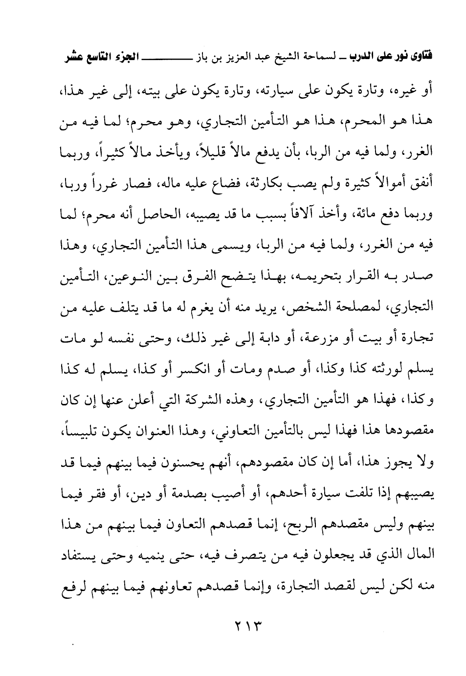 أو غيره، وتارة يكون على سيارته، وتارة يكون على بيته، إلى غير هذا، هذا هو المحرم، هذا هو التأمين التجاري، وهو محرم؛ لما فيه من الغرر، ولما فيه من الربا، بأن يدفع مالاً قليلاً، ويأخذ مالاً كثيرًا، وربما أنفق أموالاً كثيرة ولم يصب بكارثة، فضاع عليه ماله، فصار غررًا وربا، وربما دفع مائة، وأخذ آلافًا بسبب ما قد يصيبه، الحاصل أنه محرم؛ لما فيه من الغرر، ولما فيه من الربا، ويسمى هذا التأمين التجاري، وهذا صدر به القرار بتحريمه، بهذا يتضح الفرق بين النوعين، التأمين التجاري، لمصلحة الشخص، يريد منه أن يغرم له ما قد يتلف عليه من تجارة أو بيت أو مزرعة، أو دابة إلى غير ذلك، وحتى نفسه لو مات يسلم لورثته كذا وكذا، أو صدم ومات أو انكسر أو كذا، يسلم له كذا وكذا، فهذا هو التأمين التجاري، وهذه الشركة التي أعلن عنها إن كان مقصودها هذا فهذا ليس بالتأمين التعاوني، وهذا العنوان يكون تلبيسًا، ولا يجوز هذا، أما إن كان مقصودهم، أنهم يحسنون فيما بينهم فيما قد يصيبهم إذا تلفت سيارة أحدهم، أو أصيب بصدمة أو دين، أو فقر فيما بينهم وليس مقصدهم الربح، إنما قصدهم التعاون فيما بينهم من هذا المال الذي قد يجعلون فيه من يتصرف فيه، حتى ينميه وحتى يستفاد منه لكن ليس لقصد التجارة، وإنما قصدهم تعاونهم فيما بينهم لرفع