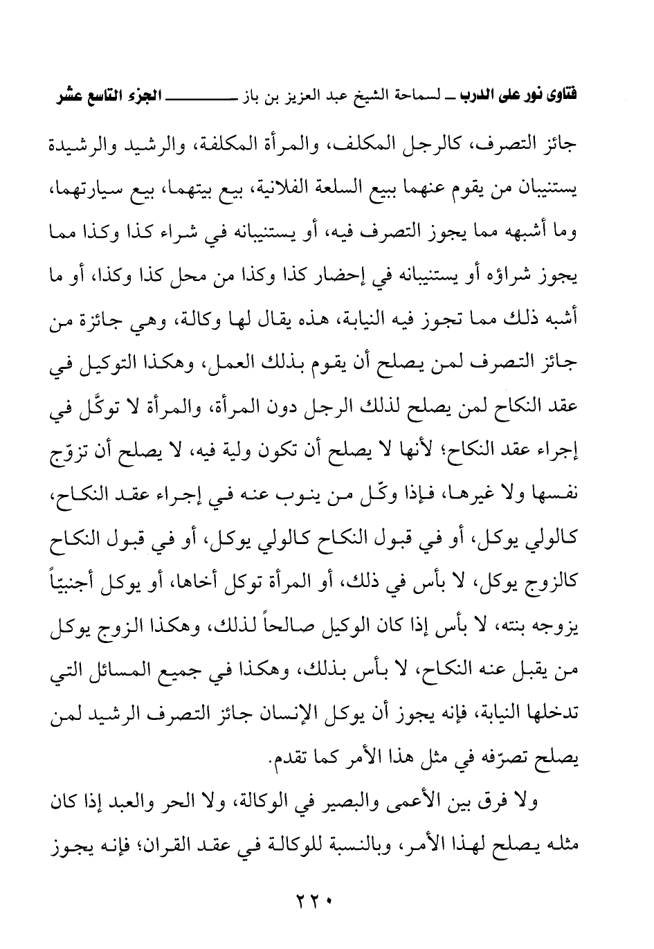 جائز التصرف، كالرجل المكلف، والمرأة المكلفة، والرشيد والرشيدة يستنيبان من يقوم عنهما ببيع السلعة الفلانية، بيع بيتهما، بيع سيارتهما، وما أشبهه مما يجوز التصرف فيه، أو يستنيبانه في شراء كذا وكذا مما يجوز شراؤه أو يستنيبانه في إحضار كذا وكذا من محل كذا وكذا، أو ما أشبه ذلك مما تجوز فيه النيابة، هذه يقال لها وكالة، وهي جائزة من جائز التصرف لمن يصلح أن يقوم بذلك العمل، وهكذا التوكيل في عقد النكاح لمن يصلح لذلك الرجل دون المرأة، والمرأة لا توكَّل في إجراء عقد النكاح؛ لأنها لا يصلح أن تكون ولية فيه، لا يصلح أن تزوّج نفسها ولا غيرها، فإذا وكّل من ينوب عنه في إجراء عقد النكاح، كالولي يوكل، أو في قبول النكاح كالولي يوكل، أو في قبول النكاح، كالزوج يوكل، لا بأس في ذلك، أو المرأة توكل أخاها، أو يوكل أجنبيًّا يزوجه بنته، لا بأس إذا كان الوكيل صالحًا لذلك، وهكذا الزوج يوكل من يقبل عنه النكاح، لا بأس بذلك، وهكذا في جميع المسائل التي تدخلها النيابة، فإنه يجوز أن يوكل الإنسان جائز التصرف الرشيد لمن يصلح تصرّفه في مثل هذا الأمر كما تقدم.