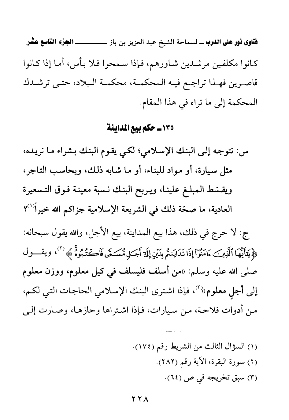 ج: لا حرج في ذلك، هذا بيع المداينة، بيع الأجل، والله يقول سبحانه: {يَاأَيُّهَا الَّذِينَ آمَنُوا إِذَا تَدَايَنْتُمْ بِدَيْنٍ إِلَى أَجَلٍ مُسَمًّى فَاكْتُبُوهُ}، ويقول صلى الله عليه وسلم: «من أسلف فليسلف في كيل معلوم، ووزن معلوم إلى أجل معلوم» (¬2) فإذا اشترى البنك الإسلامي الحاجات التي لكم، من أدوات فلاحة، من سيارات، فإذا اشتراها وحازها، وصارت إلى