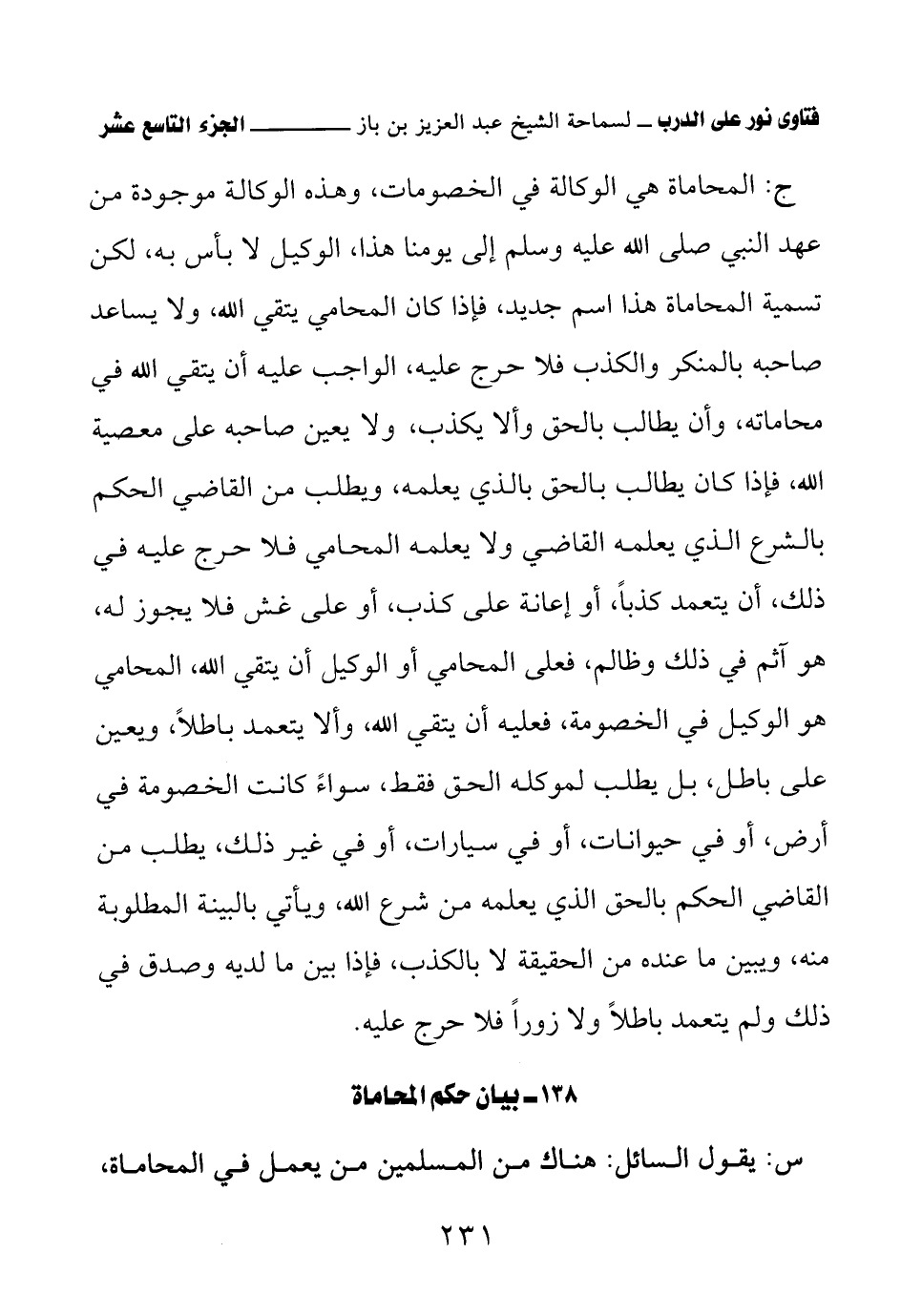 ج: المحاماة هي الوكالة في الخصومات، وهذه الوكالة موجودة من عهد النبي صلى الله عليه وسلم إلى يومنا هذا، الوكيل لا بأس به، لكن تسمية المحاماة هذا اسم جديد، فإذا كان المحامي يتقي الله، ولا يساعد صاحبه بالمنكر والكذب فلا حرج عليه، الواجب عليه أن يتقي الله في محاماته، وأن يطالب بالحق وألا يكذب، ولا يعين صاحبه على معصية الله، فإذا كان يطالب بالحق بالذي يعلمه، ويطلب من القاضي الحكم بالشرع الذي يعلمه القاضي ولا يعلمه المحامي فلا حرج عليه في ذلك، أن يتعمد كذبًا، أو إعانة على كذب، أو على غش فلا يجوز له، هو آثم في ذلك وظالم، فعلى المحامي أو الوكيل أن يتقي الله، المحامي هو الوكيل في الخصومة، فعليه أن يتقي الله، وألا يتعمد باطلاً، ويعين على باطل، بل يطلب لموكله الحق فقط، سواءً كانت الخصومة في أرض، أو في حيوانات، أو في سيارات، أو في غير ذلك، يطلب من القاضي الحكم بالحق الذي يعلمه من شرع الله، ويأتي بالبينة المطلوبة منه، ويبين ما عنده من الحقيقة لا بالكذب، فإذا بين ما لديه وصدق في ذلك ولم يتعمد باطلاً ولا زورًا فلا حرج عليه.