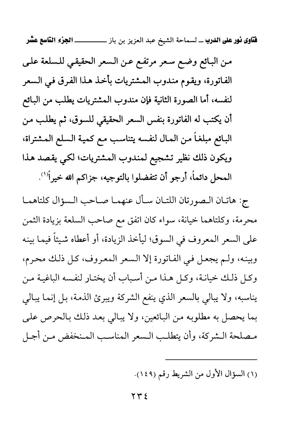 ج: هاتان الصورتان اللتان سأل عنهما صاحب السؤال كلتاهما محرمة، وكلتاهما خيانة، سواء كان اتفق مع صاحب السلعة بزيادة الثمن على السعر المعروف في السوق؛ ليأخذ الزيادة، أو أعطاه شيئًا فيما بينه وبينه، ولم يجعل في الفاتورة إلا السعر المعروف، كل ذلك محرم، وكل ذلك خيانة، وكل هذا من أسباب أن يختار لنفسه الباغية من يناسبه، ولا يبالي بالسعر الذي ينفع الشركة ويبرئ الذمة، بل إنما يبالي بما يحصل به مطلوبه من البائعين، ولا يبالي بعد ذلك بالحرص على مصلحة الشركة، وأن يتطلب السعر المناسب المنخفض من أجل