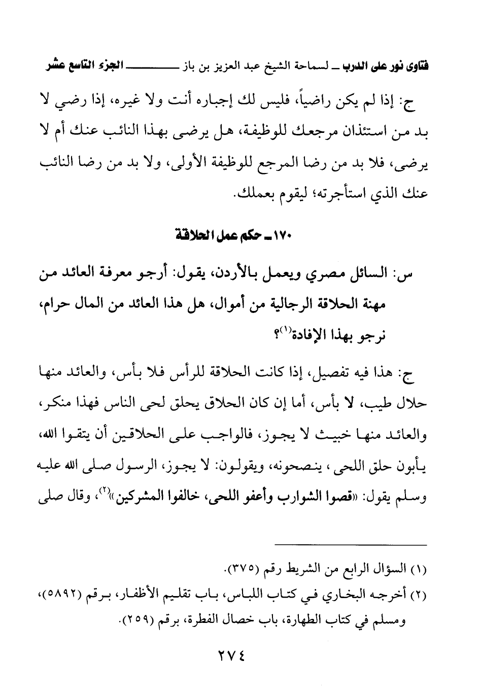 ج: هذا فيه تفصيل، إذا كانت الحلاقة للرأس فلا بأس، والعائد منها حلال طيب، لا بأس، أما إن كان الحلاق يحلق لحى الناس فهذا منكر، والعائد منها خبيث لا يجوز، فالواجب على الحلاقين أن يتقوا الله، يأبون حلق اللحى، ينصحونه، ويقولون: لا يجوز، الرسول صلى الله عليه وسلم يقول: «قصوا الشوارب وأعفو اللحى، خالفوا المشركين» (¬2) وقال صلى