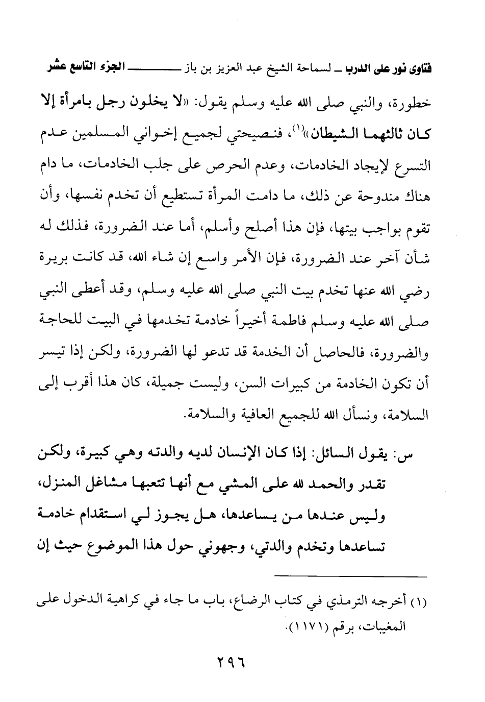 خطورة، والنبي صلى الله عليه وسلم يقول: «لا يخلون رجل بامرأة إلا كان ثالثهما الشيطان» (¬1) فنصيحتي لجميع إخواني المسلمين عدم التسرع لإيجاد الخادمات، وعدم الحرص على جلب الخادمات، ما دام هناك مندوحة عن ذلك، ما دامت المرأة تستطيع أن تخدم نفسها، وأن تقوم بواجب بيتها، فإن هذا أصلح وأسلم، أما عند الضرورة، فذلك له شأن آخر عند الضرورة، فإن الأمر واسع إن شاء الله، قد كانت بريرة رضي الله عنها تخدم بيت النبي صلى الله عليه وسلم، وقد أعطى النبي صلى الله عليه وسلم فاطمة أخيرًا خادمة تخدمها في البيت للحاجة والضرورة، فالحاصل أن الخدمة قد تدعو لها الضرورة، ولكن إذا تيسر أن تكون الخادمة من كبيرات السن، وليست جميلة، كان هذا أقرب إلى السلامة، ونسأل الله للجميع العافية والسلامة.