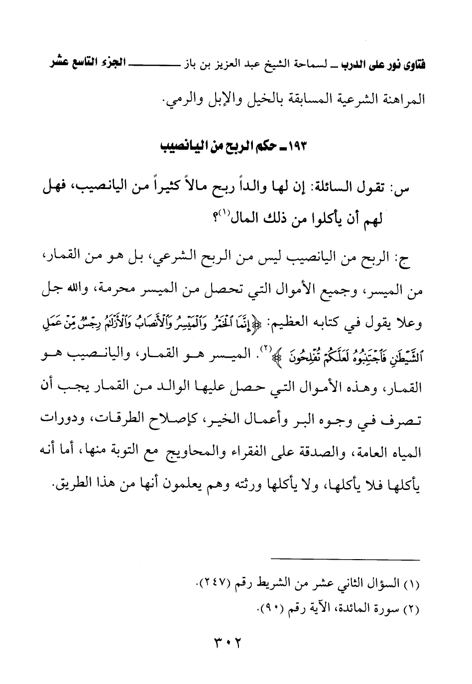 ج: الربح من اليانصيب ليس من الربح الشرعي، بل هو من القمار، من الميسر، وجميع الأموال التي تحصل من الميسر محرمة، والله جل وعلا يقول في كتابه العظيم: {إِنَّمَا الْخَمْرُ وَالْمَيْسِرُ وَالْأَنْصَابُ وَالْأَزْلاَمُ رِجْسٌ مِنْ عَمَلِ الشَّيْطَانِ فَاجْتَنِبُوهُ لَعَلَّكُمْ تُفْلِحُونَ}. الميسر هو القمار، واليانصيب هو القمار، وهذه الأموال التي حصل عليها الوالد من القمار يجب أن تصرف في وجوه البر وأعمال الخير، كإصلاح الطرقات، ودورات المياه العامة، والصدقة على الفقراء والمحاويج مع التوبة منها، أما أنه يأكلها فلا يأكلها، ولا يأكلها ورثته وهم يعلمون أنها من هذا الطريق.