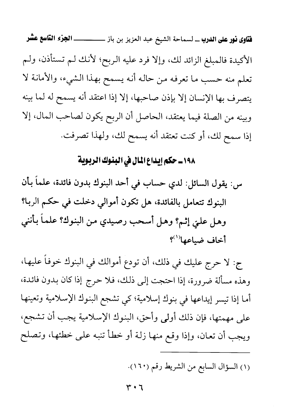 ج: لا حرج عليك في ذلك، أن تودع أموالك في البنوك خوفًا عليها، وهذه مسألة ضرورة، إذا احتجت إلى ذلك، فلا حرج إذا كان بدون فائدة، أما إذا تيسر إيداعها في بنوك إسلامية، كي تشجع البنوك الإسلامية وتعينها على مهمتها، فإن ذلك أولى وأحق، البنوك الإسلامية يجب أن تشجع، ويجب أن تعان، وإذا وقع زلة أو خطأ تنبه على خطئها، وتصلح