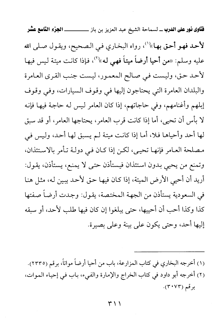 لأحد فهو أحق بها» (¬1) رواه البخاري في الصحيح، ويقول صلى الله عليه وسلم: «من أحيا أرضا ميتًا فهي له» (¬2) فإذا كانت ميتة ليس فيها لأحد حق، وليست في صالح المعمور، ليست جنب القرى العامرة والبلدان العامرة التي يحتاجون إليها في وقوف السيارات، وفي وقوف إبلهم وأغنامهم، وفي حاجاتهم، إذا كان العامر ليس له حاجة فيها فإنه لا بأس أن تحيى، أما إذا كانت قرب العامر، يحتاجها العامر، أو قد سبق لها أحد وأحياها فلا، أما إذا كانت ميتة لم يسبق لها أحد، وليس في مصلحة العامر فإنها تحيى، لكن إذا كان في دولة تأمر بالاستئذان، وتمنع من يحيي بدون استئذان فيستأذن حتى لا يمنع، يستأذن، يقول: أريد أن أحيي الأرض الميتة، إذا كان فيها حق لأحد يبين له، مثل هنا في السعودية يستأذن من الجهة المختصة، يقول: وجدت أرضًا صفتها كذا وكذا أحب أن أحييها، حتى يبلغوا إن كان فيها طلب لأحد، أو سبقه إليها أحد، وحتى يكون على بينة وعلى بصيرة.