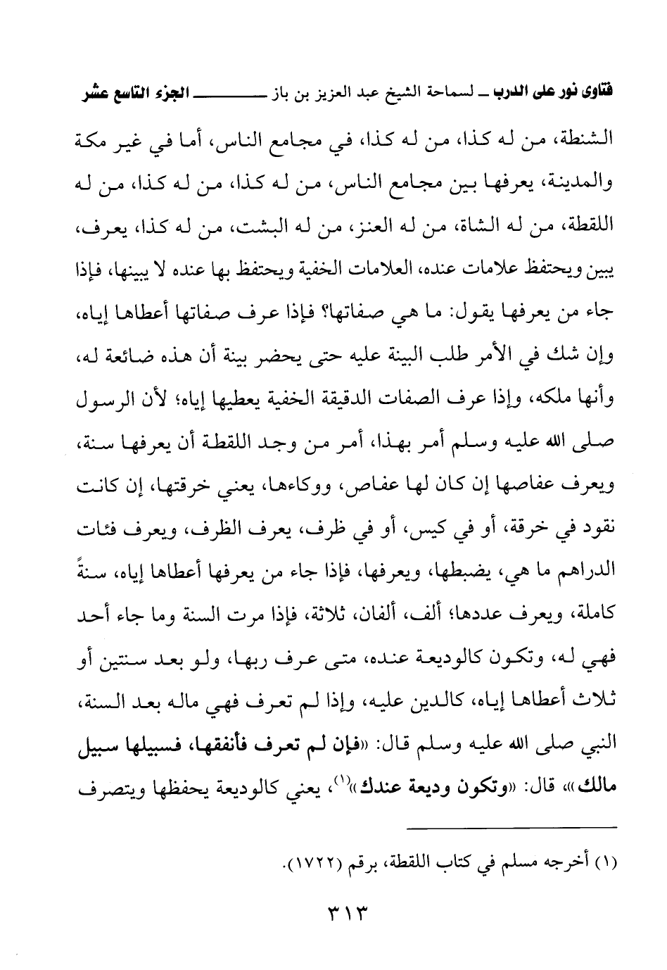 الشنطة، من له كذا، من له كذا، في مجامع الناس، أما في غير مكة والمدينة، يعرفها بين مجامع الناس، من له كذا، من له كذا، من له اللقطة، من له الشاة، من له العنز، من له البشت، من له كذا، يعرف يبين ويحتفظ علامات عنده، العلامات الخفية ويحتفظ بها عنده لا يبينها، فإذا جاء من يعرفها يقول: ما هي صفاتها؟ فإذا عرف صفاتها أعطاها إياه، وإن شك في الأمر طلب البينة عليه حتى يحضر بينة أن هذه ضائعة له، وأنها ملكه، وإذا عرف الصفات الدقيقة الخفية يعطيها إياه، لأن الرسول صلى الله عليه وسلم أمر بهذا، أمر من وجد اللقطة أن يعرفها سنة، ويعرف عفاصها إن كان لها عفاص، ووكاءها، يعني خرقتها، إن كانت نقود في خرقة، أو في كيس، أو في ظرف، يعرف الظرف، ويعرف فئات الدراهم ما هي، يضبطها، ويعرفها، فإذا جاء من يعرفها أعطاها إياه، سنةً كاملة، ويعرف عددها، ألف، ألفان، ثلاثة، فإذا مرت السنة وما جاء أحد فهي له، وتكون كالوديعة عنده، متى عرف ربها، ولو بعد سنتين أو ثلاث أعطاها إياه، كالدين عليه، وإذا لم تعرف فهي ماله بعد السنة، النبي صلى الله عليه وسلم قل: «فإن لم تعرف فأنفقها، فسبيلها سبيل مالك. قال: وتكون وديعة عندك» (¬1) يعني كالوديعة يحفظها ويتصرف