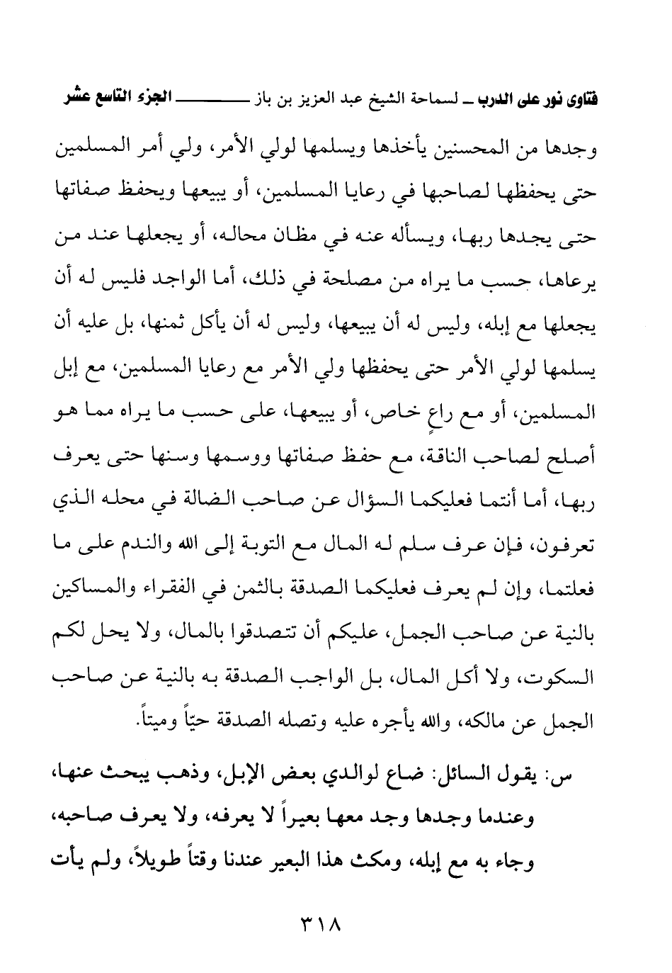 وجدها من المحسنين يأخذها ويسلمها لولي الأمر، ولي أمر المسلمين حتى يحفظها لصاحبها في رعايا المسلمين، أو يبيعها ويحفظ صفاتها حتى يجدها ربها، ويسأله عنه في مظان محاله، أو يجعلها عند من يرعاها، حسب ما يراه من مصلحة في ذلك، أما الواجد فليس له أن يجعلها مع إبله، وليس له أن يبيعها، وليس له أن يأكل ثمنها، بل عليه أن يسلمها لولي الأمر حتى يحفظها ولي الأمر مع رعايا المسلمين، مع إبل المسلمين، أو مع راعٍ خاص، أو يبيعها على حسب ما يراه مما هو أصلح لصاحب الناقة، مع حفظ صفاتها ووسمها وسنها حتى يعرف ربها، أما أنتما فعليكما السؤال عن صاحب الضالة في محله الذي تعرفون، فإن عرف سلم له المال مع التوبة إلى الله والندم على ما فعلتما، وإن لم يعرف فعليكما الصدقة بالثمن في الفقراء والمساكين بالنية عن صاحب الجمل، عليكم أن تتصدقوا بالمال، ولا يحل لكم السكوت، ولا أكل المال، بل الواجب الصدقة به بالنية عن صاحب الجمل عن مالكه، والله يأجره عليه وتصله الصدقة حيًّا وميتًا.