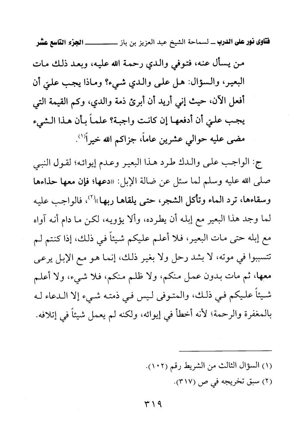 ج: الواجب على والدك طرد هذا البعير وعدم إيوائه، لقول النبي صلى الله عليه وسلم «لما سئل عن ضالة الإبل: دعها، فإن معها حذاءها وسقاءها، ترد الماء وتأكل الشجر، حتى يلقاها ربها» (¬1) فالواجب عليه لما وجد هذا البعير مع إبله أن يطرده، وألا يؤويه، لكن ما دام أنه آواه مع إبله حتى مات البعير، فلا أعلم عليكم شيئًا في ذلك، إذا كنتم لم تتسببوا في موته، لا بشد رحل ولا بغير ذلك، إنما هو مع الإبل يرعى معها، ثم مات بدون عمل منكم، ولا ظلم منكم، فلا شيء ولا أعلم شيئًا عليكم في ذلك والمتوفى ليس في ذمته شيء إلا الدعاء له بالمغفرة والرحمة، لأنه أخطأ في إيوائه، ولكنه لم يعمل شيئًا في إتلافه.