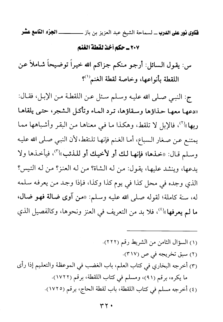 ج: النبي صلى الله عليه وسلم «سئل عن اللقطة من الإبل، فقال: دعها معها حذاؤها وسقاؤها، ترد الماء وتأكل الشجر، حتى يلقاها ربها» (¬2) فالإبل لا تلقط، وهكذا ما في معناها من البقر وأشباهها مما يمتنع عن صغار السباع، أما الغنم فإنها تلتقط، لأن النبي صلى الله عليه وسلم قال: «خذها، فإنها لك أو لأخيك أو للذئب» (¬3) فيأخذها ولا يدعها، وينشد عليها، يقول: من له الشاة؟ من له العنز؟ من له التيس؟ الذي وجده في محل كذا في يوم كذا وكذا، فإذا وجد من يعرفه سلمه له، سنة كاملة، لقوله صلى الله عليه وسلم: «من آوى ضالة فهو ضال، ما لم يعرفها» (¬4) فلا بد من التعريف في العنز ونحوها، وكالفصيل الذي