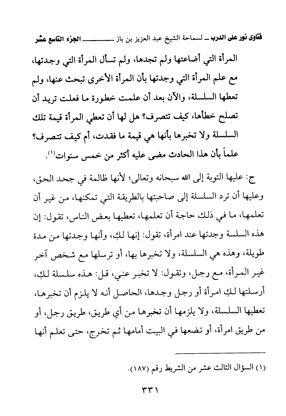 ج: عليها التوبة إلى الله سبحانه وتعالى، لأنها ظالمة في جحد الحق، وعليها أن ترد السلسلة إلى صاحبتها بالطريقة التي تمكنها، من غير أن تعلمها، ما في ذلك حاجة أن تعلمها، تعطيها بعض الناس، تقول: إن هذه السلسلة وجدتها عند امرأة تقول: إنها لكِ، وأنها وجدتها من مدة طويلة، وهذه هي السلسلة، ولا تخبرها بها، أو ترسلها مع شخص آخر غير المرأة، مع رجل وتقول لا تخبر عني، قل: هذه سلسلة لكِ، أرسلتها لكِ امرأة أو رجل وجدها، الحاصل أنه لا يلزم أن تخبرها، تعطيها السلسلة، ولا يلزمها أن تخبرها من أي طريق، طريق رجل، أو من طريق امرأة، أو تضعها في البيت أمامها ثم تخرج، حتى تعلم أنها