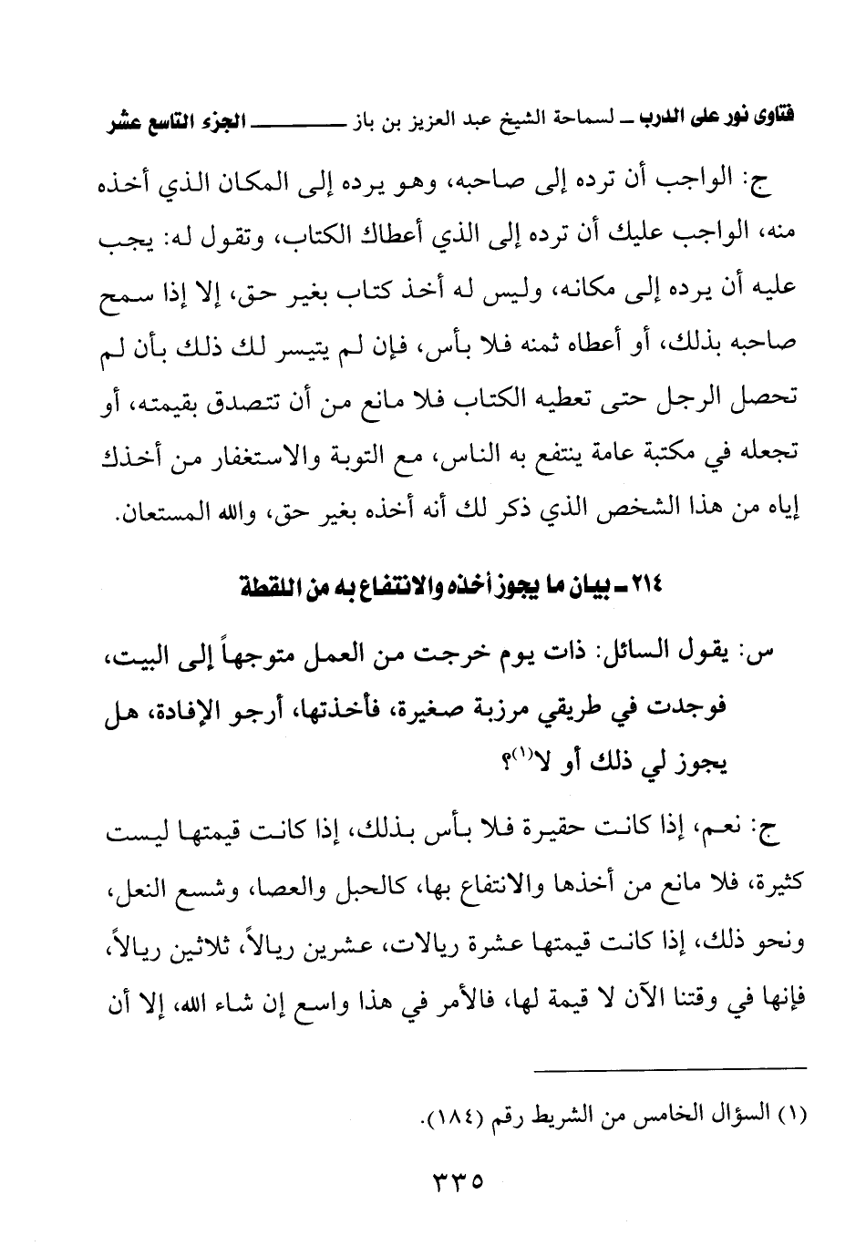 214 - بيان ما يجوز أخذه والانتفاع به من اللقطة
