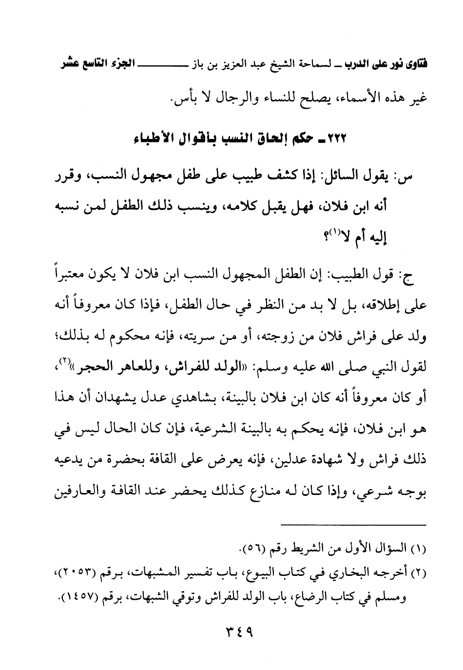 ج: قول الطبيب، إن الطفل المجهول النسب ابن فلان لا يكون معتبرًا على إطلاقه، بل لا بد من النظر في حال الطفل، فإذا كان معروفا أنه ولد على فراش فلان من زوجته، أو من سريته، فإنه محكوم له بذلك، لقول النبي صلى الله عليه وسلم: «الولد للفراش، وللعاهر الحجر» (¬2) أو كان معروفًا أنه كان ابن فلان بالبينة، بشاهدي عدل يشهدان أن هذا هو ابن فلان، فإنه يحكم به بالبينة الشرعية، فإن كان الحال ليس في ذلك فراش، ولا شهادة عدلين، فإنه يعرض على القافة بحضرة من يدعيه بوجه شرعي، وإذا كان له منازع كذلك يحضر عند القافة والعارفين