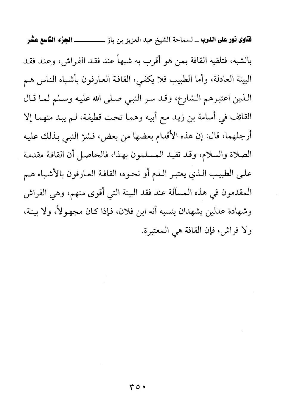 بالشبه، فتلقيه القافة بمن هو أقرب به شبهًا عند فقد الفراش، وعند فقد البينة العادلة، وأما الطبيب فلا يكفي، القافة العارفون بأشباه الناس هم الذين اعتبرهم الشارع، وقد سر النبي صلى الله عليه وسلم لما قال القائف في أسامة بن زيد مع أبيه وهما تحت قطيفة، لم يبد منهما إلا أرجلهما، قال: إن هذه الأقدام بعضها من بعض، فسُرَّ النبي بذلك عليه الصلاة والسلام، وقد تقيد المسلمون بهذا، فالحاصل أن القافة مقدمة على الطبيب الذي يعتبر الدم أو نحوه، القافة العارفون بالأشباه هم المقدمون في هذه المسألة عند فقد البينة التي أقوى منهم، وهي الفراش وشهادة عدلين يشهدان بنسبه أنه ابن فلان، فإذا كان مجهولاً، ولا بينة، ولا فراش، فإن القافة هي المعتبرة.