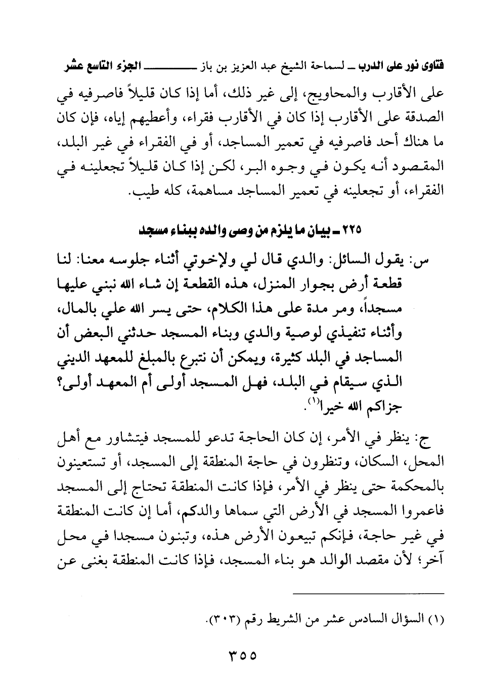 س: يقول السائل: والدي قال لي ولإخوتي أثناء جلوسه معنا: لنا قطعة أرض بجوار المنزل، هذه القطعة إن شاء الله نبني عليها مسجدًا، ومر مدة على هذا الكلام، حتى يسر الله علي بالمال، وأثناء تنفيذي لوصية والدي ببناء المسجد حدثني البعض أن المساجد في البلد كثيرة، ويمكن أن نتبرع بالمبلغ للمعهد الديني، الذي سيقام في البلد، فهل المسجد أولى أم المعهد أولى؟ جزاكم الله خيرًا (¬1).