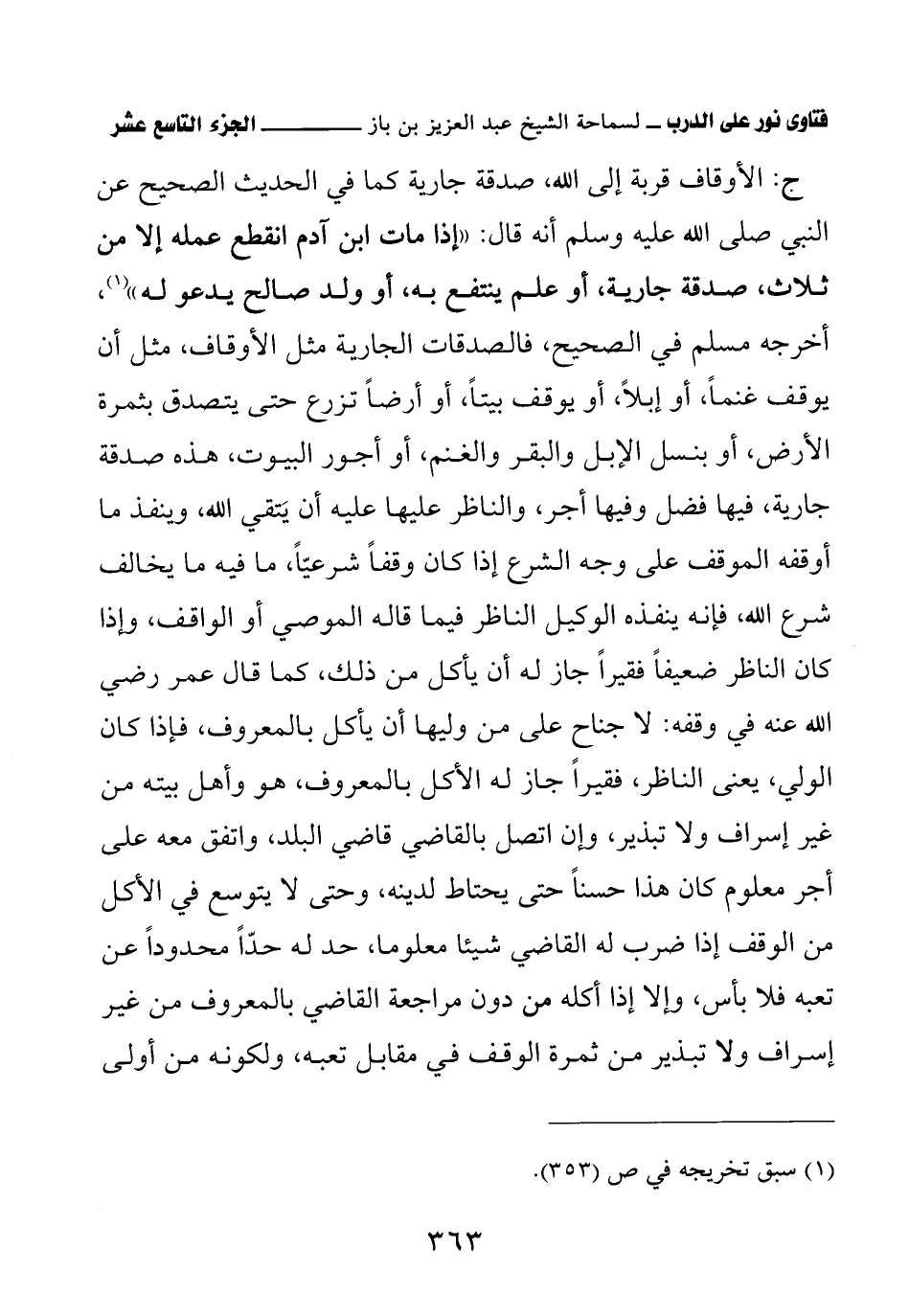 ج: الأوقاف قربة إلى الله، صدقة جارية كما في الحديث الصحيح عن النبي صلى الله عليه وسلم أنه قال: «إذا مات ابن آدم انقطع عمله إلا من ثلاث، صدقة جارية، أو علم ينتفع به، أو ولد صالح يدعو له» (¬1) أخرجه مسلم في الصحيح، فالصدقات الجارية مثل الأوقاف، مثل أن يوقف غنمًا، أو إبلاً، أو يوقف بيتًا، أو أرضًا تزرع حتى يتصدق بثمرة الأرض، أو بنسل الإبل والبقر والغنم، أو أجور البيوت، هذه صدقة جارية، فيها فضل وفيها أجر، والناظر عليها عليه أن يَتقي الله، وينفذ ما أوقفه الموقف على وجه الشرع إذا كان وقفًا شرعيًّا، ما فيه ما يخالف شرع الله، فإنه ينفذه الوكيل الناظر فيما قاله الموصي أو الواقف، وإذا كان الناظر ضعيفًا فقيرًا جاز له أن يأكل من ذلك، كما قال عمر رضي الله عنه في وقفه: لا جناح على من وليها أن يأكل بالمعروف، فإذا كان الولي، يعني الناظر فقيرًا جاز له الأكل بالمعروف، هو وأهل بيته من غير إسراف ولا تبذير، وإن اتصل بالقاضي قاضي البلد، واتفق معه على أجر معلوم كان هذا حسنًا حتى يحتاط لدينه، وحتى لا يتوسع في الأكل من الوقف إذا ضرب له القاضي شيئا معلوما، حد له حدًّا محدودًا عن تعبه فلا بأس، وإلا إذا أكله من دون مراجعة القاضي بالمعروف من غير إسراف ولا تبذير من ثمرة الوقف في مقابل تعبه، ولكونه من أولى