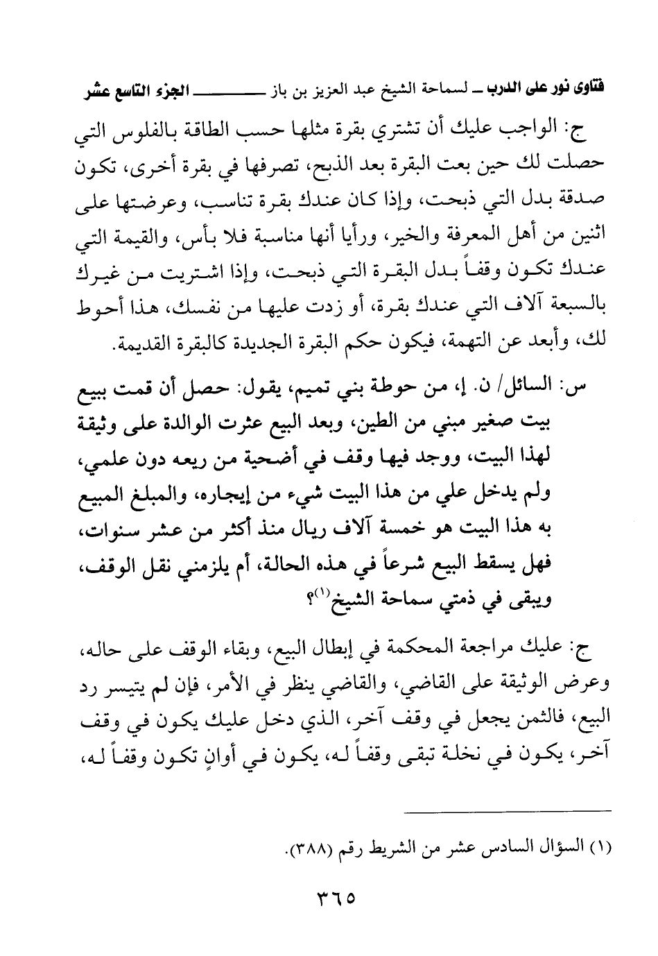 س: السائل / ن. إ. من حوطة بني تميم، يقول: حصل أن قمت ببيع بيت صغير مبني من الطين، وبعد البيع عثرت الوالدة على وثيقة لهذا البيت، ووجد فيها وقف في أضحية من ريعه دون علمي، ولم يدخل علي من هذا البيت شيء من إيجاره، والمبلغ المبيع به هذا البيت هو خمسة آلاف ريال منذ أكثر من عشر سنوات، فهل يسقط البيع شرعًا في هذه الحالة، أم يلزمني نقل الوقف، ويبقى في ذمتي سماحة الشيخ؟